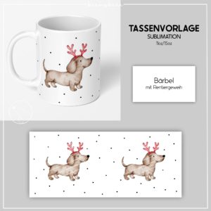 Den Anfang macht unsere süße Dackeldame Bärbel mit ihrem witzigen Rentier-Geweih als Tassenvorlage, passend zu unserem ersten Türchen im Plott- und Stickkalender.
