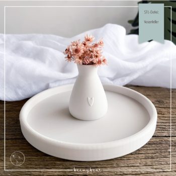 PLA und echte Kerzen sind keine gute Kombi und so hatte ich die Idee, statt eines Kerzenhalters ein kleines Väschen zu integrieren. Das kennt ihr vielleicht schon aus dem Shop, ich finde es so niedlich. Mit ein paar Trockenblümchen sieht der Teller dann einfach zauberhaft aus. Den Teller kann man nach Geschmack noch mit einem Plott oder EasyRub versehen. Ihr findet den Teller in 3 Größen in der Datei.
