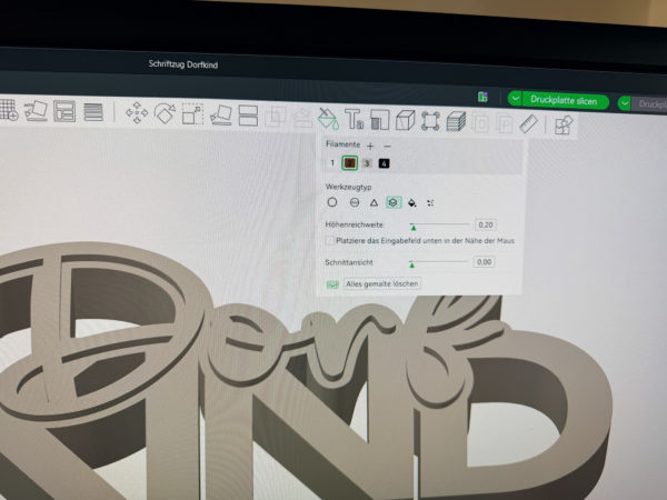 Lasse das Objekt markiert und klicke oben auf den Farbeimer. In dem Fenster, was sich dadurch öffnet, wählst du die zweite Farbe für oben (hier dem filigranen Wort Dorf) aus und das Höhen-Icon. Du kannst hier auch einstellen, wenn du mehr Höhe zum Färben hast, dass du den Schieberegler einfach ein bisschen nach rechts ziehst.