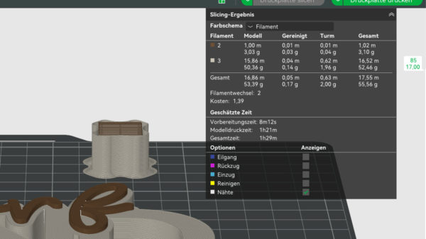 Slice die Druckplatte nun und das farbige Objekt wandelt sich um in den Reinigungsturm. Dieser ist völlig normal, sobald man mehrfarbig druckt. Den Turm kannst du zusammen mit anderen Filamentresten sammeln und zum recyclen z.B. an 3Eulendesign schicken, darüber freuen sie sich sehr. Wenn es dich interessiert, wieviel Filament für diesen Turm verwendet wird, findest du alle Infos dazu auch in der Infografik in deinem Slicer.