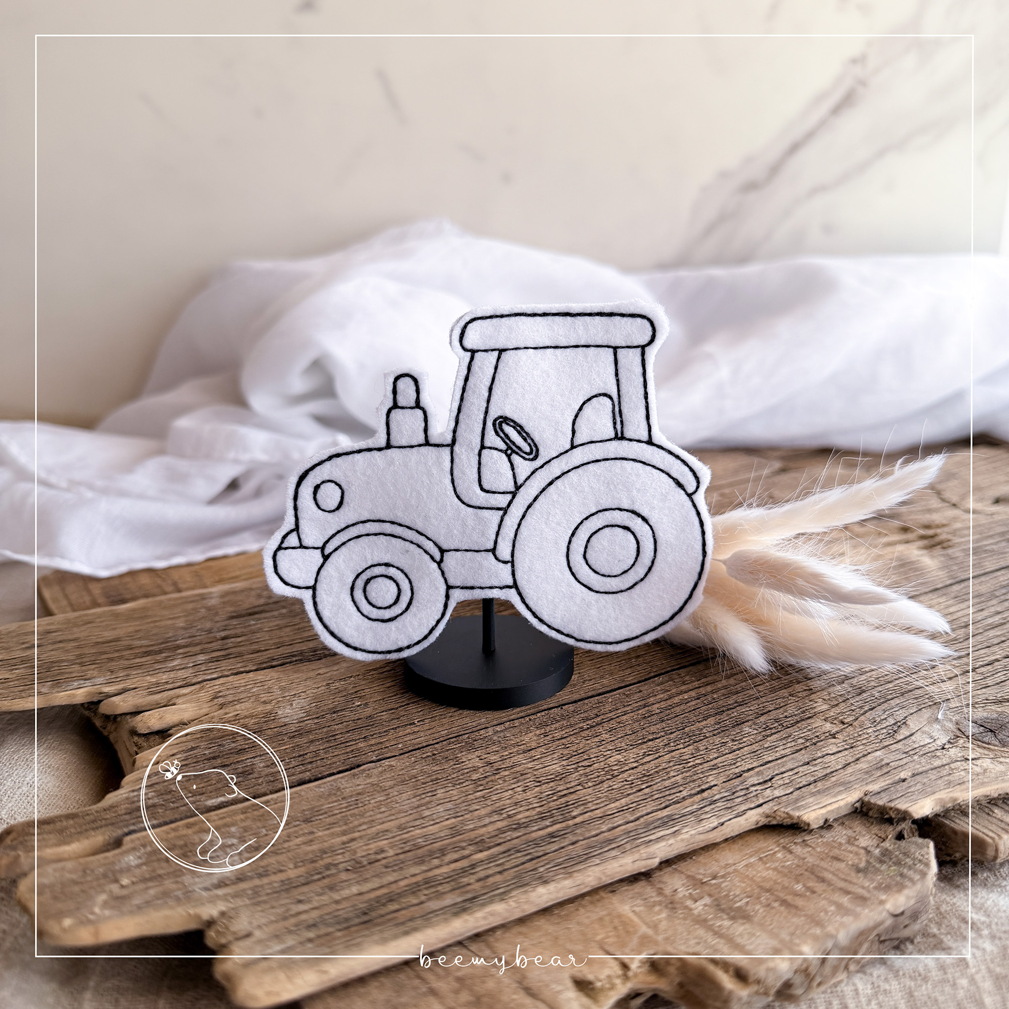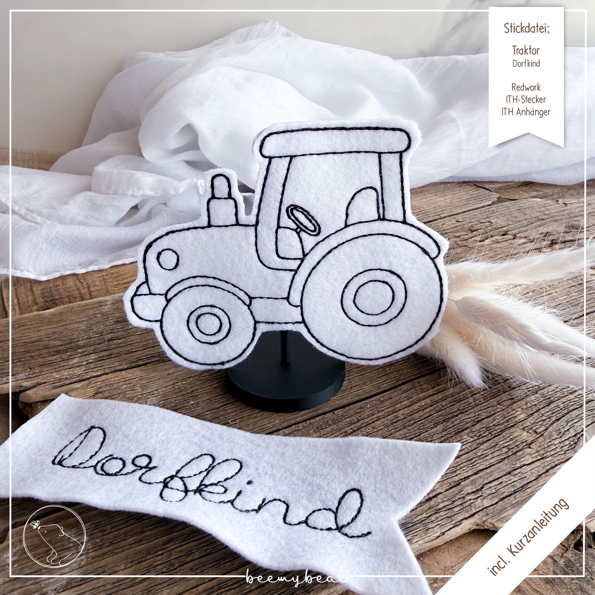 Mit diesem Set kannst du dir meinen Traktor mit dem Spruch „Dorfkind“ in Redwork und ITH-Stecker/-Anhänger sticken. Eine generelle Kurzanleitung zum ITH-sticken liegt bei.