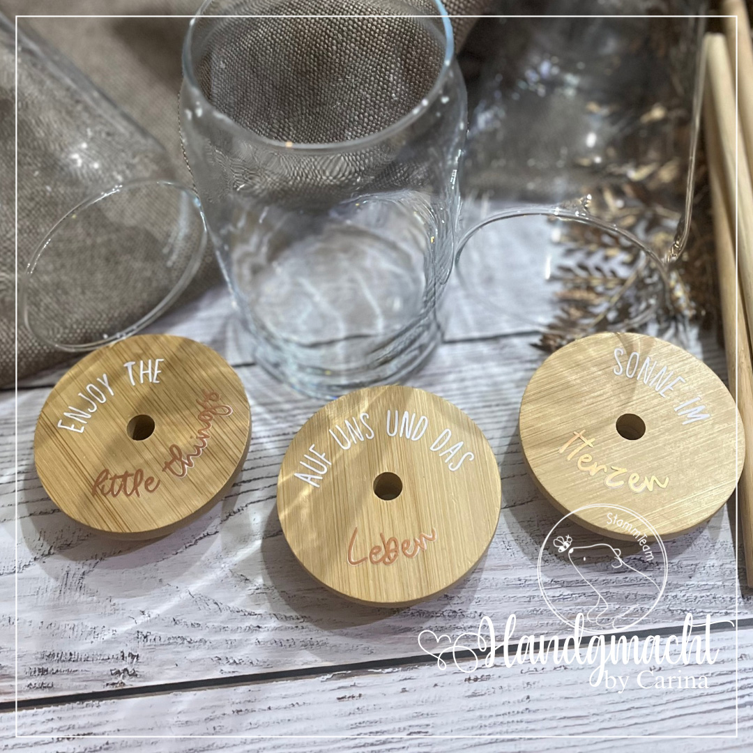 Mit diesem wundervollen Set kannst du z.B. die hübschen Gläser mit Holzdeckel (mit Strohhalm) sommerlich gravieren.