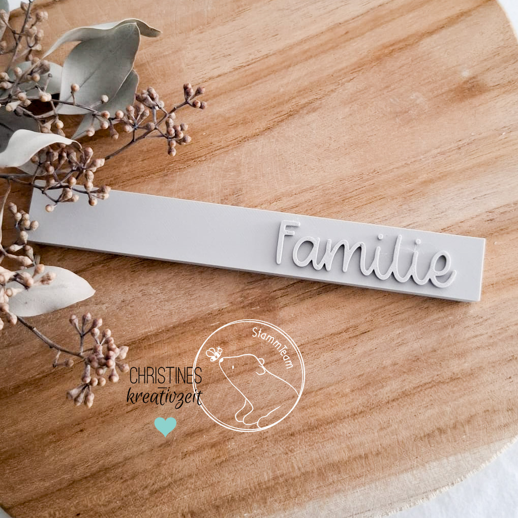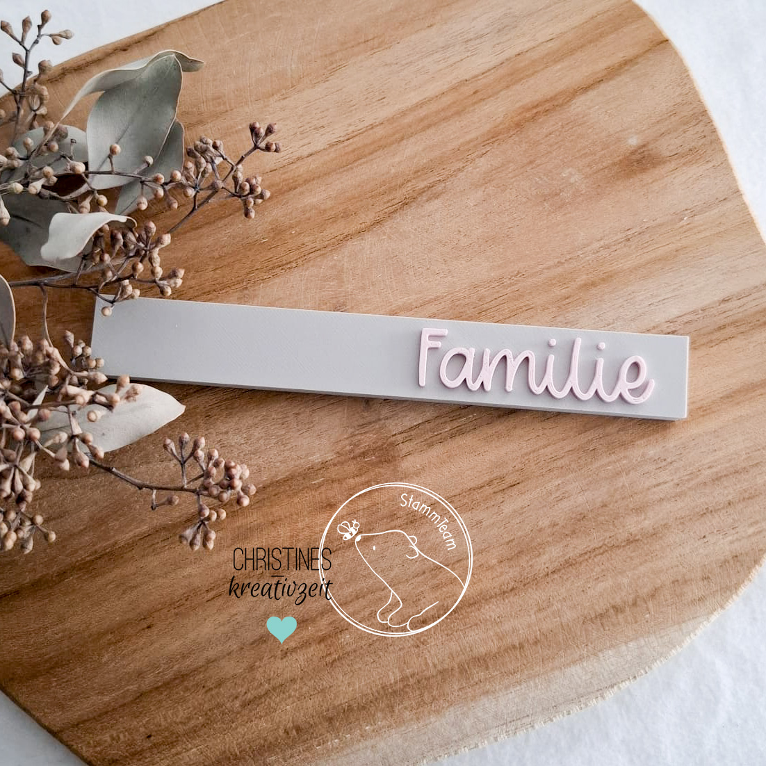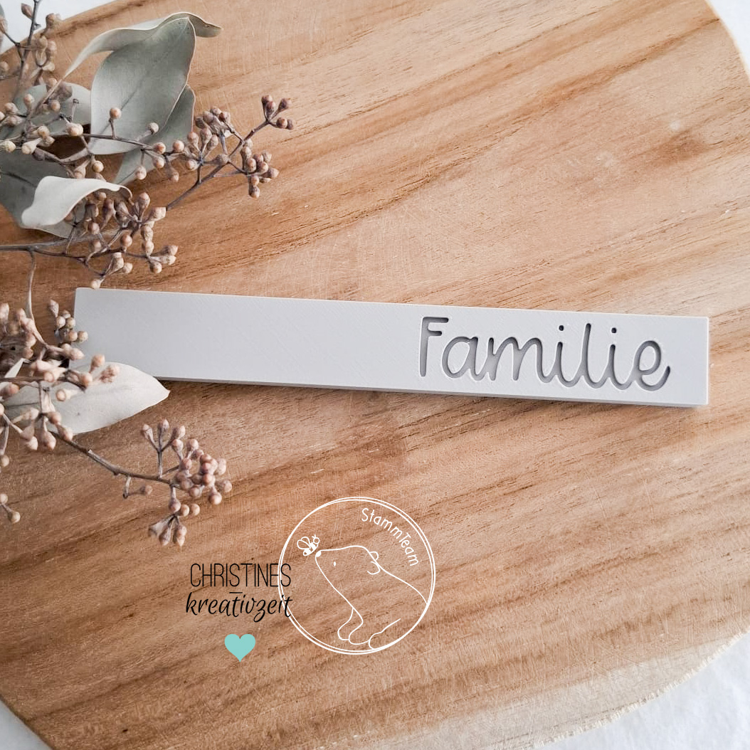 Mit dieser STL-Datei kannst dir ein Klötzchen mit dem Schriftzug Familie drucken, die du auch mit den bekannten Holzklötzchen kombinieren kannst. Unser Klötzchen hat passend dazu die Maße 22x8x160. Der Schriftzug ist einmal als Gravur und einmal als Relief enthalten, dass du dir in deinem Slicer noch mal einfärben kannst um einen tollen Effekt zu erzielen.