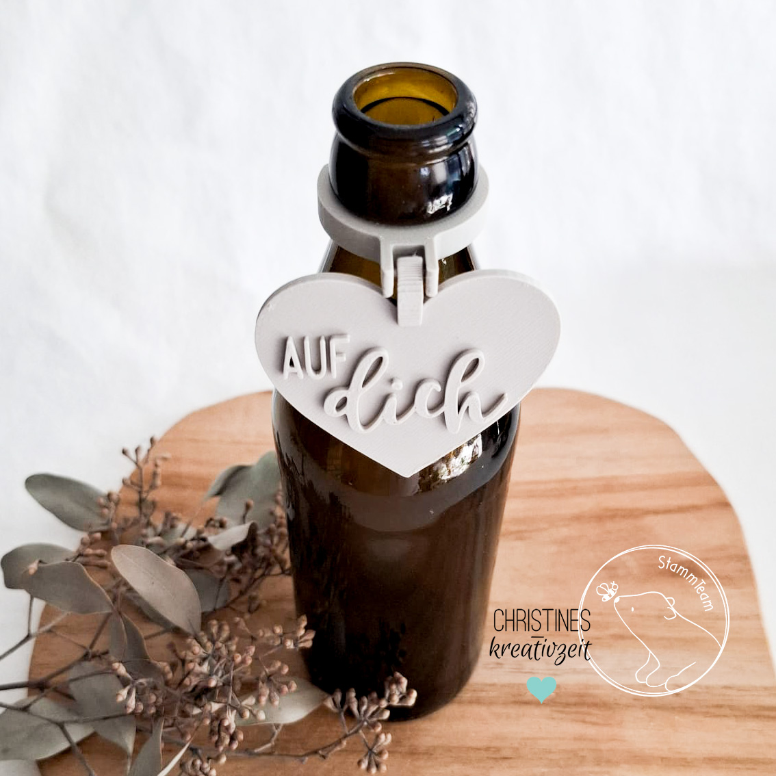 Mit dieser STL-Datei kannst dir den süßen Flaschenclip Herz „Auf dich“ drucken, um eine 0,33 Glasflasche aufzupimpen.