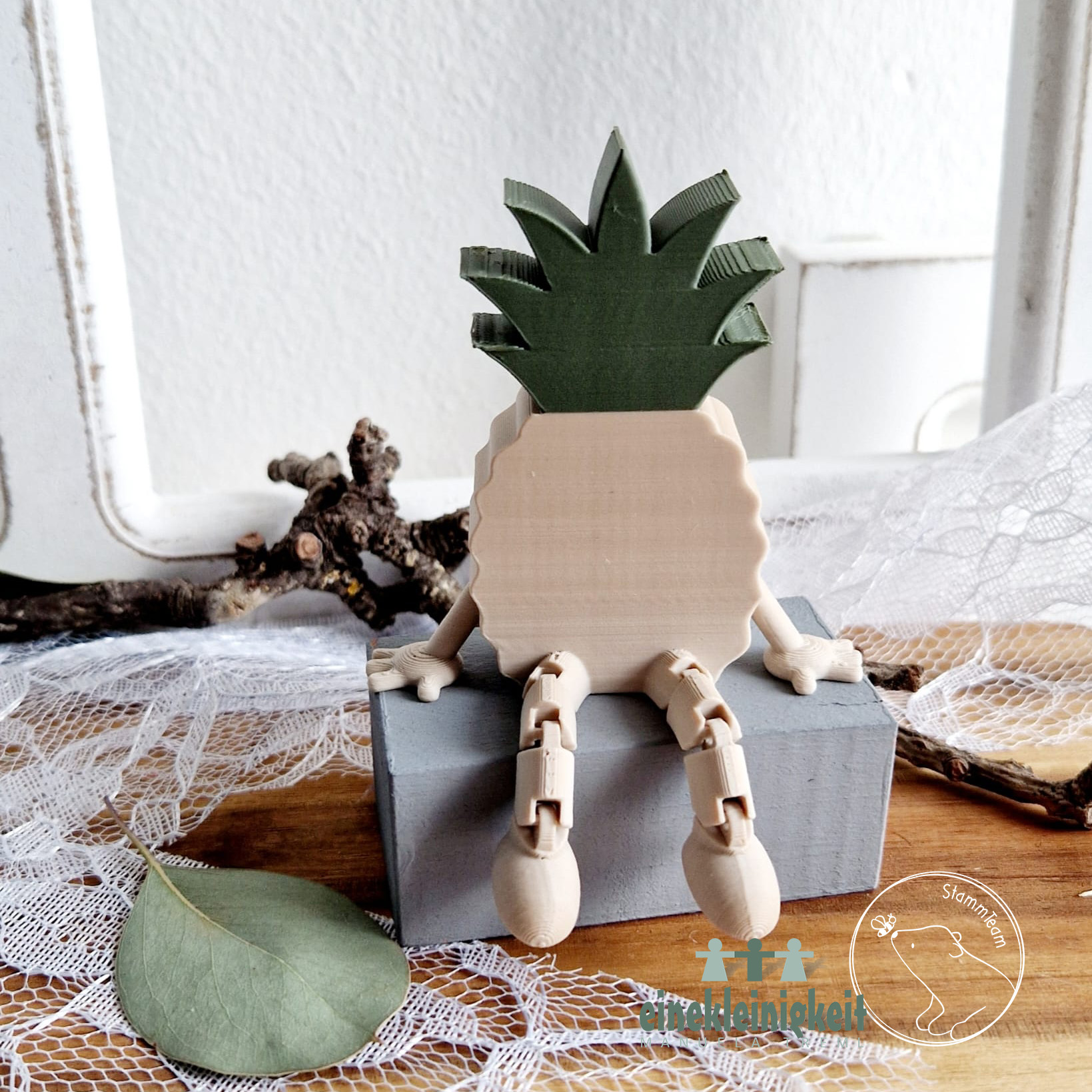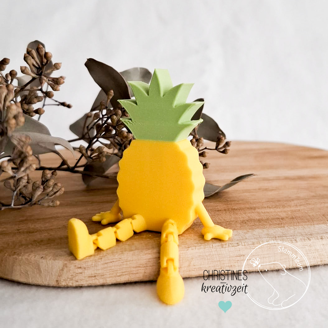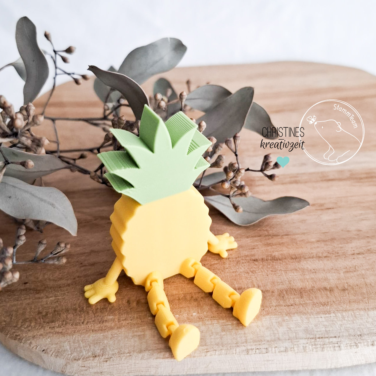 Du erhältst diese süße Ananas mit Wackelbeinchen und Armen. In unseren Tests konnten wir sie problemlos bis zur Hälfte verkleinern, so dass du dir eine ganze Bande in vielen unterschiedlichen Größen drucken kannst.
