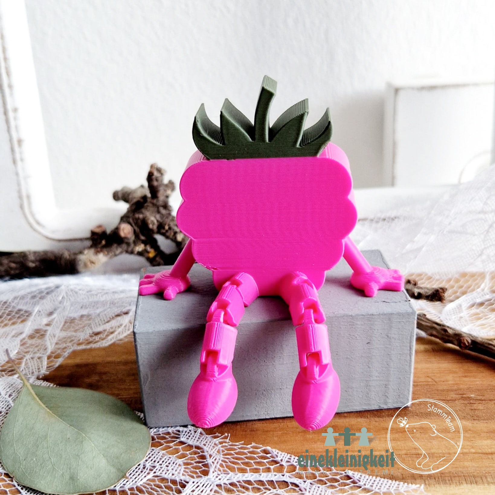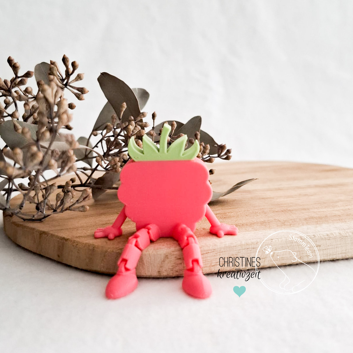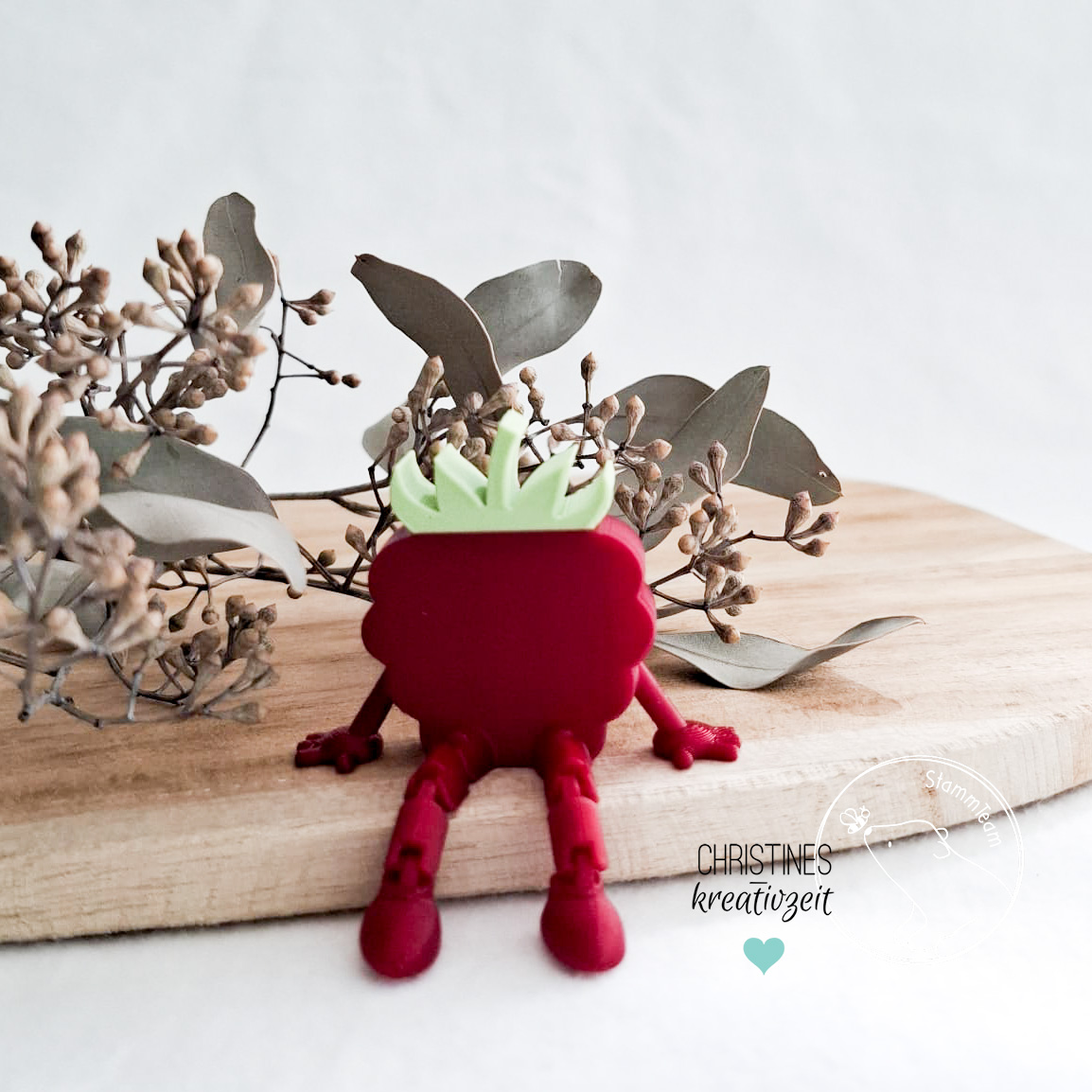 Du erhältst diese süße Himbeere mit Wackelbeinchen und Armen. In unseren Tests konnten wir sie problemlos bis zur Hälfte verkleinern, so dass du dir eine ganze Bande in vielen unterschiedlichen Größen drucken kannst.
