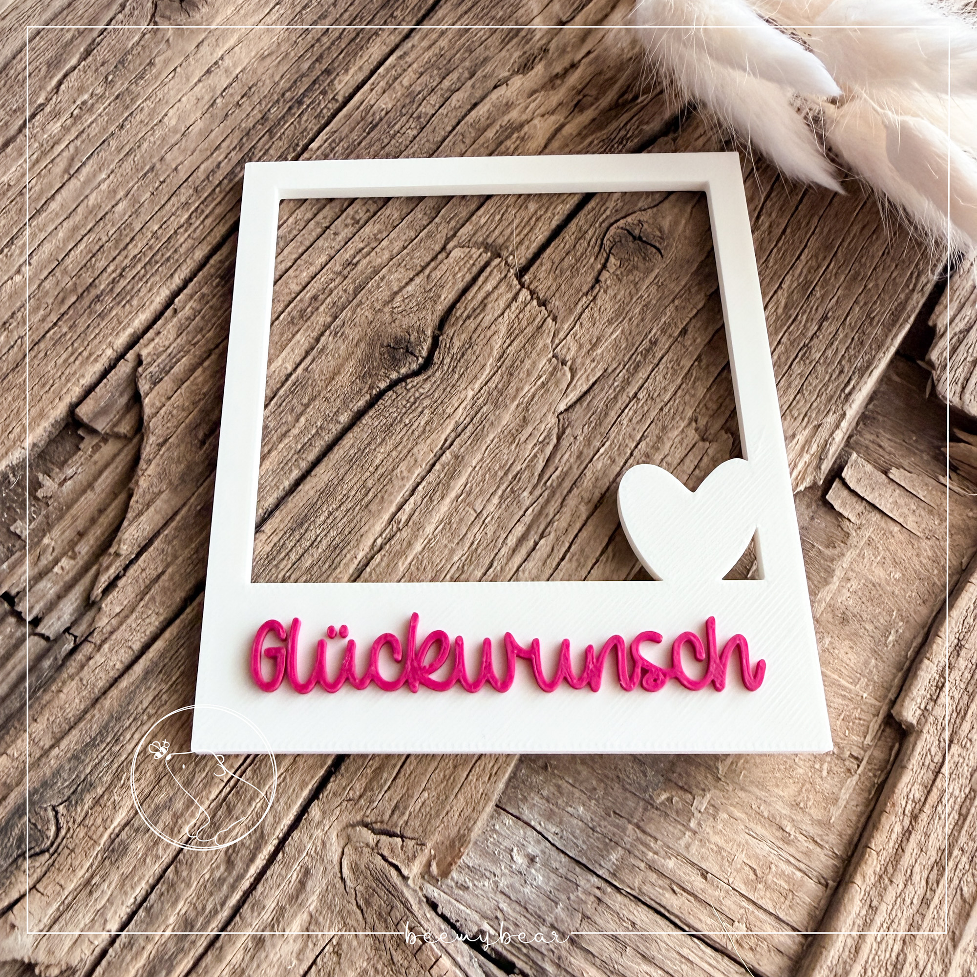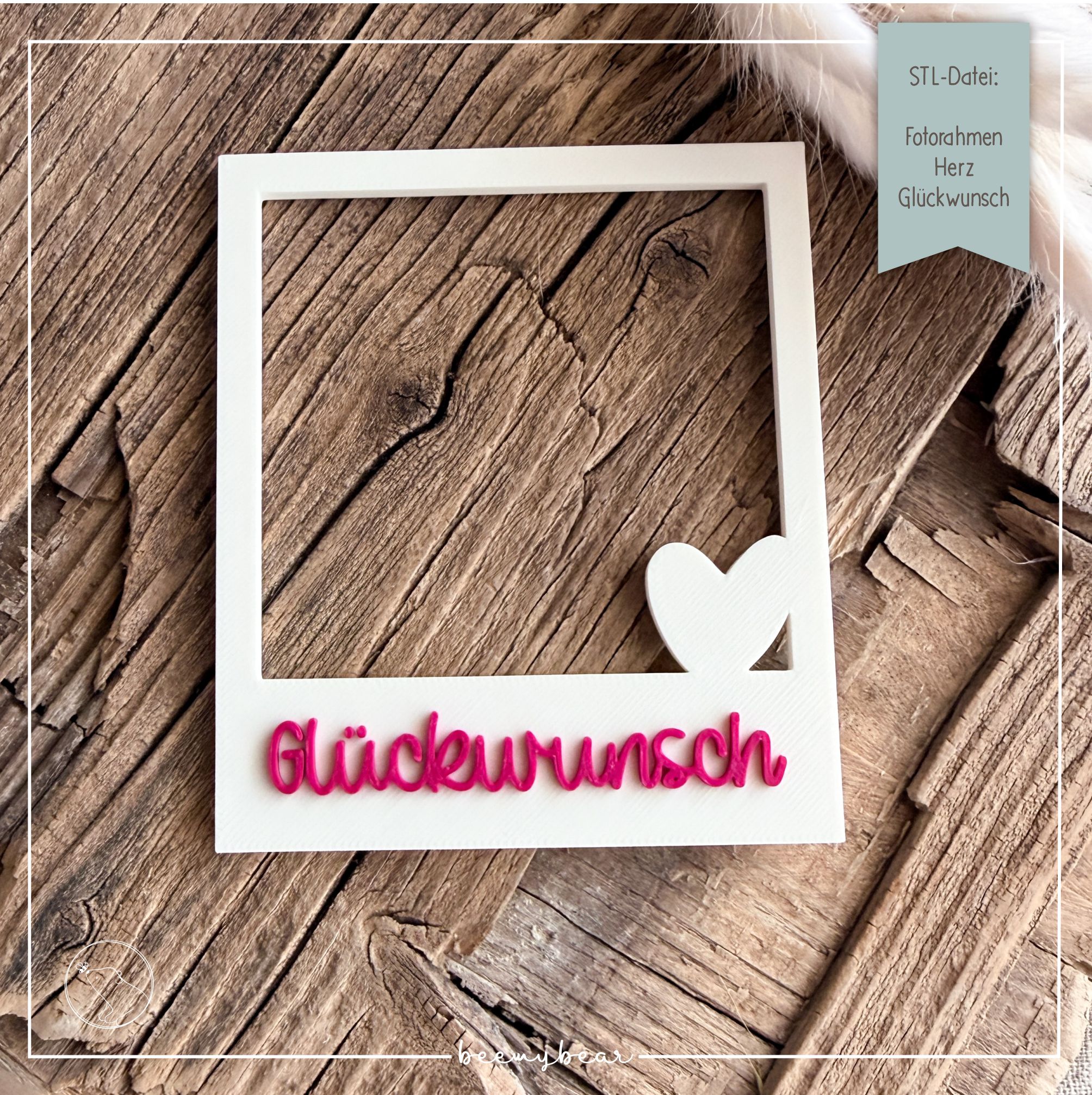 Mit dieser STL-Datei kannst dir den Fotorahmen Herz  aus der Laserdatei Fotorahmen mit der Aufschrift „Glückwunsch“ drucken. Den süßen Fotorahmen kannst du z.B. nutzen, um durch ihn hindurch zu fotografieren um besondere Momente wundervoll festzuhalten. Zusätzlich ist in der Datei eine Rückwand enthalten, die du optional drucken und dann zusammen kleben kannst. Durch die praktische Erhöhung der Rückwand ist Platz, dass du ein Foto einschieben und so verschenken kannst.
