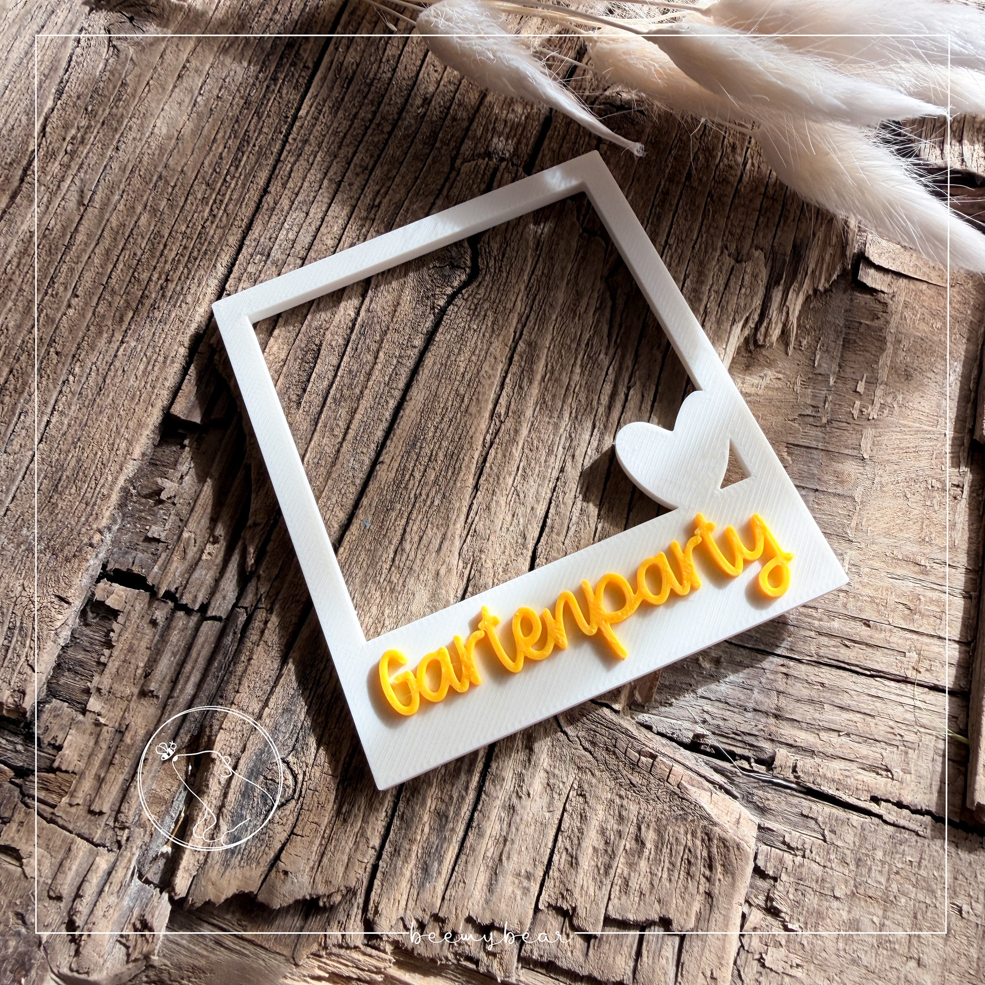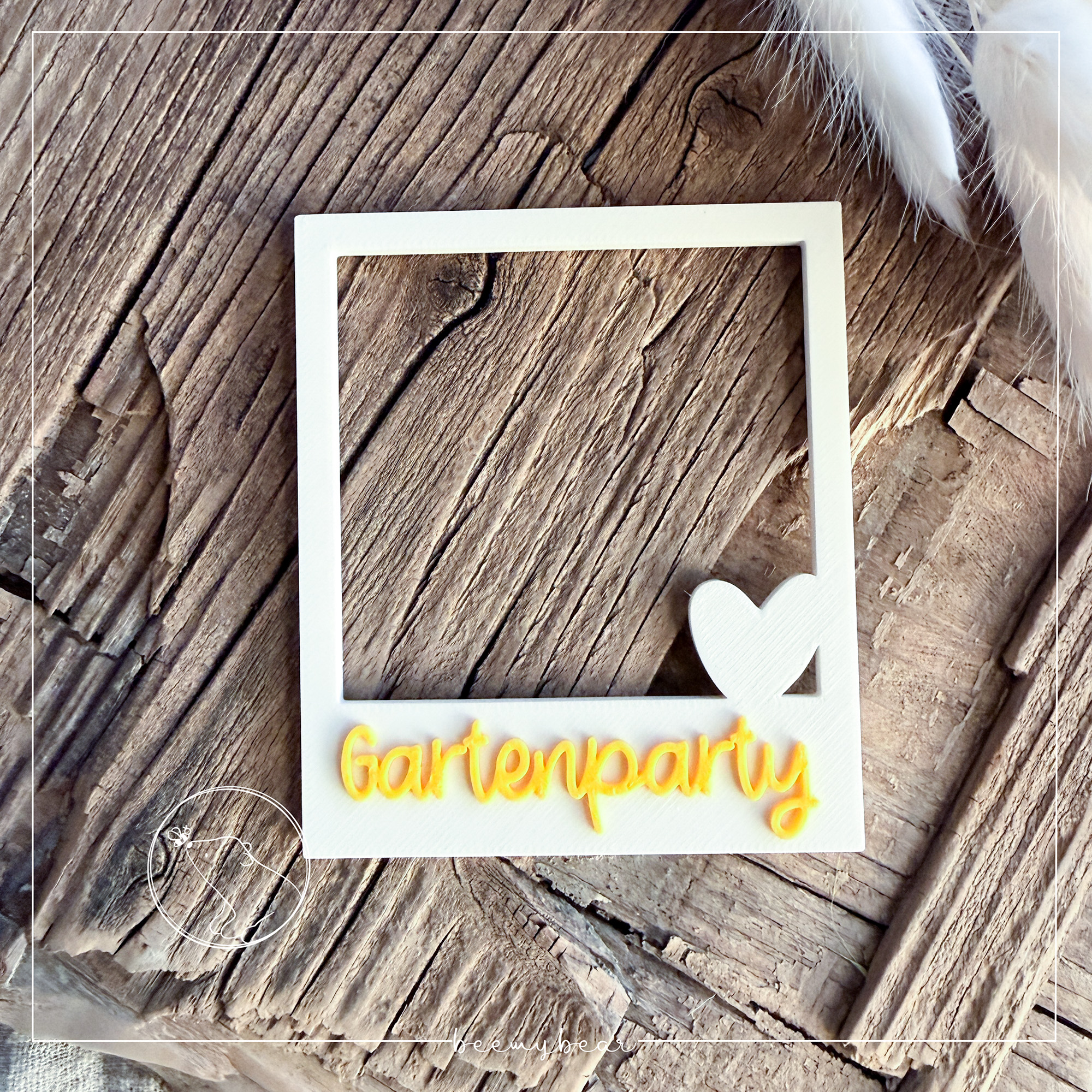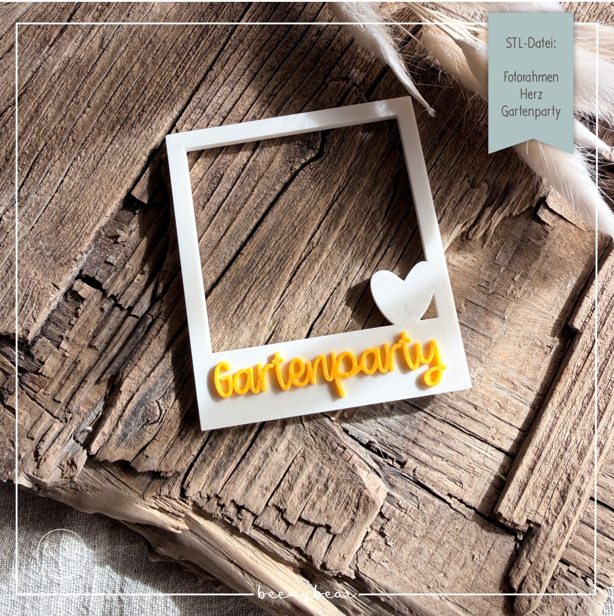 Mit dieser STL-Datei kannst dir den Fotorahmen Herz aus der Laserdatei Fotorahmen mit der Aufschrift „Gartenparty“ drucken. Den süßen Fotorahmen kannst du z.B. nutzen, um durch ihn hindurch zu fotografieren um besondere Momente wundervoll festzuhalten. Zusätzlich ist in der Datei eine Rückwand enthalten, die du optional drucken und dann zusammen kleben kannst. Durch die praktische Erhöhung der Rückwand ist Platz, dass du ein Foto einschieben und so verschenken kannst.