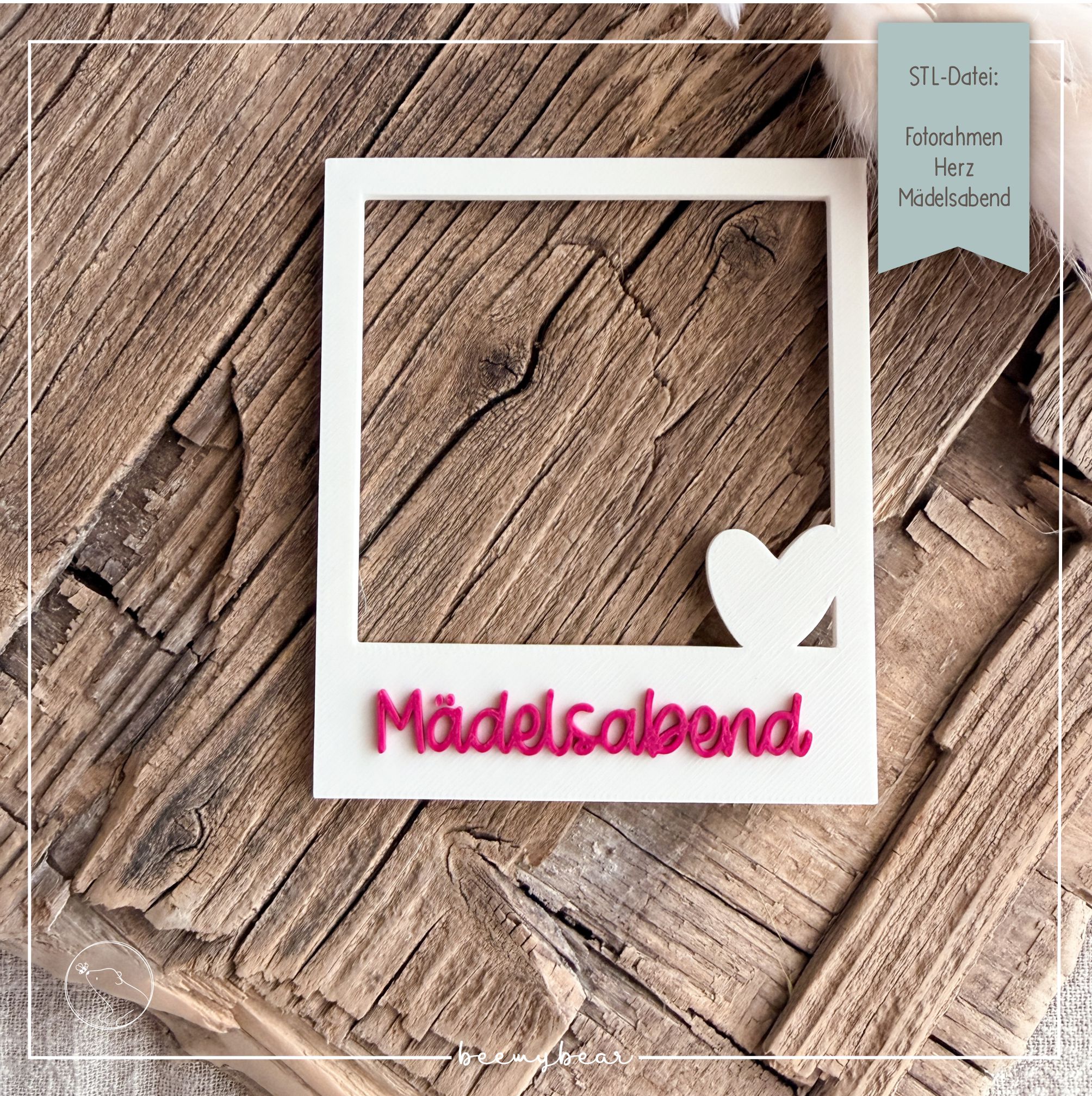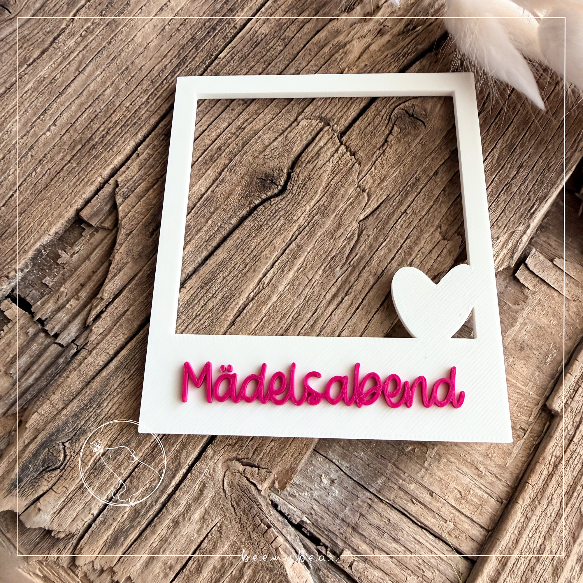 Mit dieser STL-Datei kannst dir den Fotorahmen Herz aus der Laserdatei Fotorahmen mit der Aufschrift „Mädelsabend“ drucken. Den süßen Fotorahmen kannst du z.B. nutzen, um durch ihn hindurch zu fotografieren um besondere Momente wundervoll festzuhalten. Zusätzlich ist in der Datei eine Rückwand enthalten, die du optional drucken und dann zusammen kleben kannst. Durch die praktische Erhöhung der Rückwand ist Platz, dass du ein Foto einschieben und so verschenken kannst.