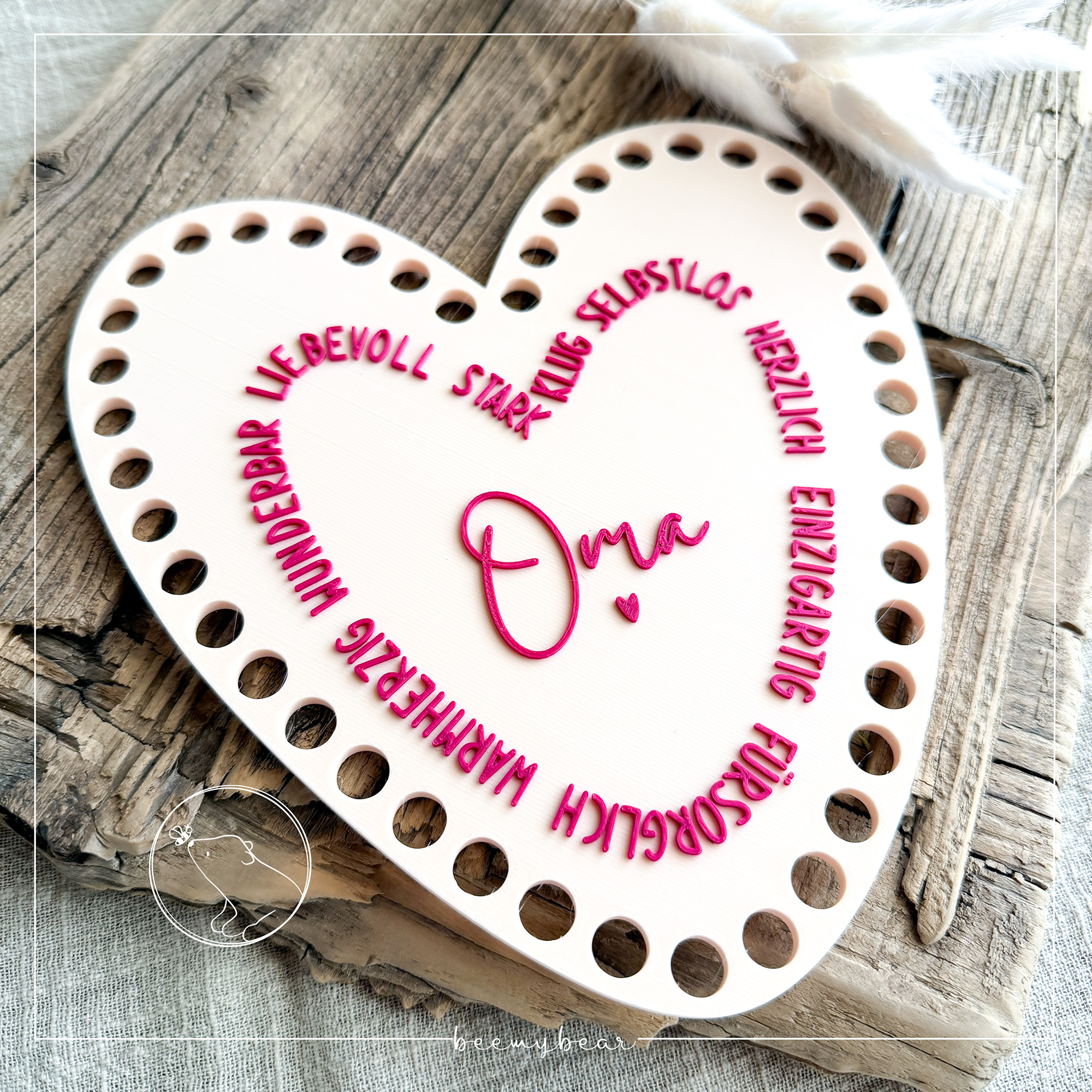 Mit dieser STL-Datei kannst du dir einen Häkelboden in Form eines Herz (Höhe ca. 18 cm, Breite ca. 17 cm) und der Aufschrift „Oma…“ aus meiner Plotterdatei Momlife – AddOn Oma für die beliebten Häkelkörbchen drucken. Die 9mm großen Löcher eignen sich perfekt für das beliebte 5mm Garn, das du in meiner Storefront findest (Link in der Sidebar)