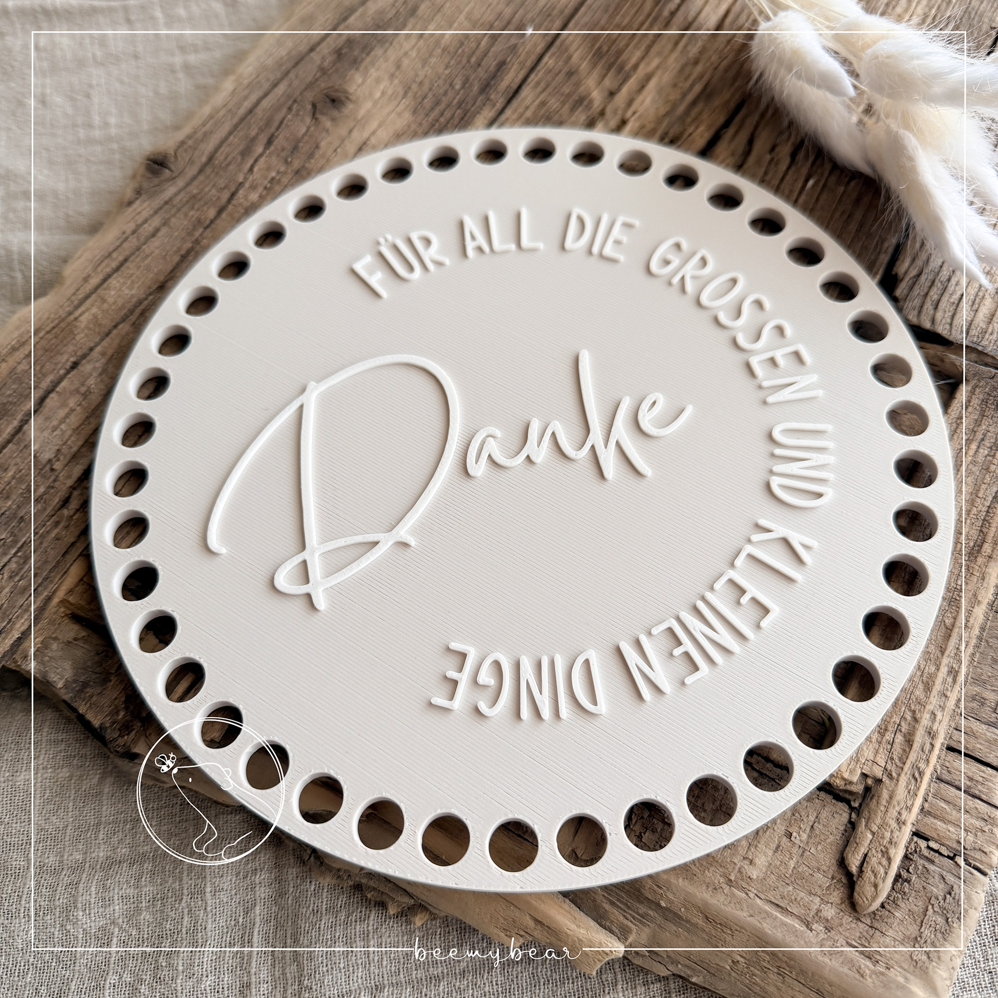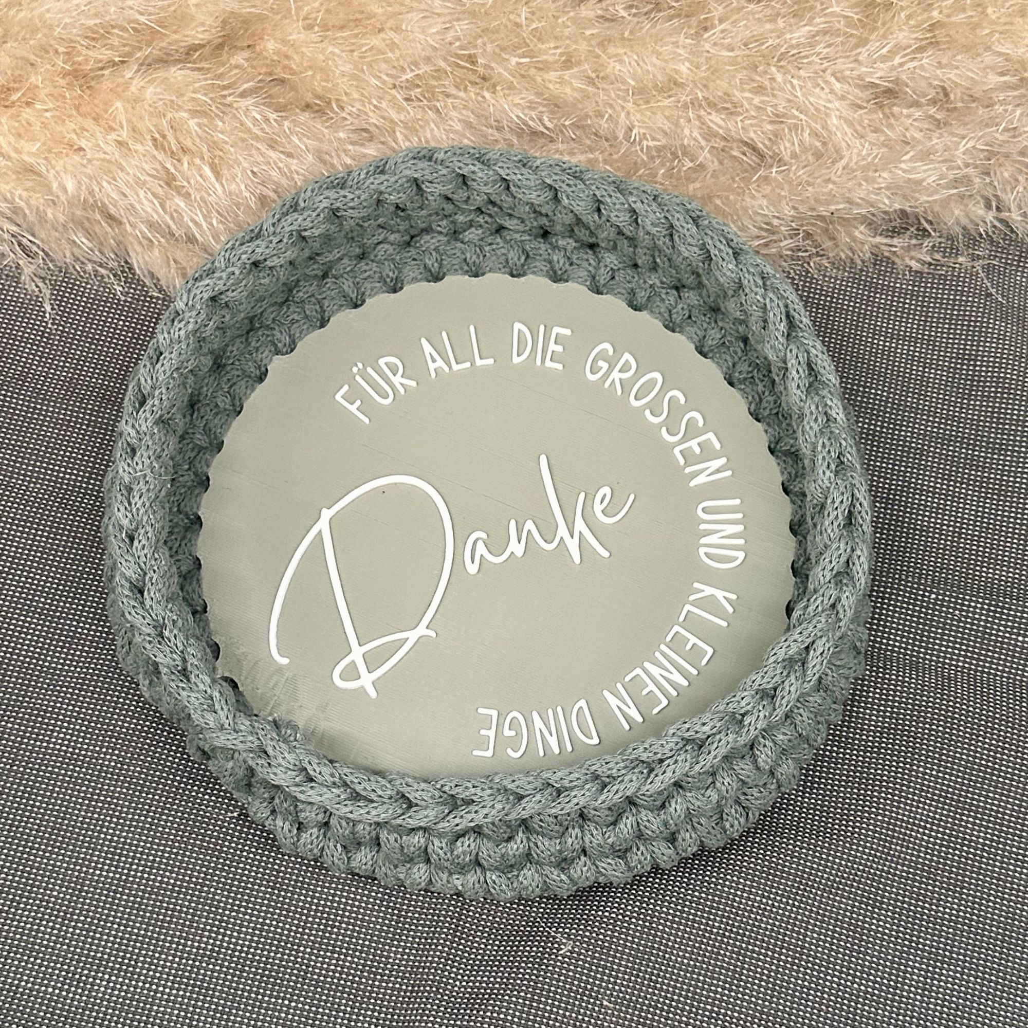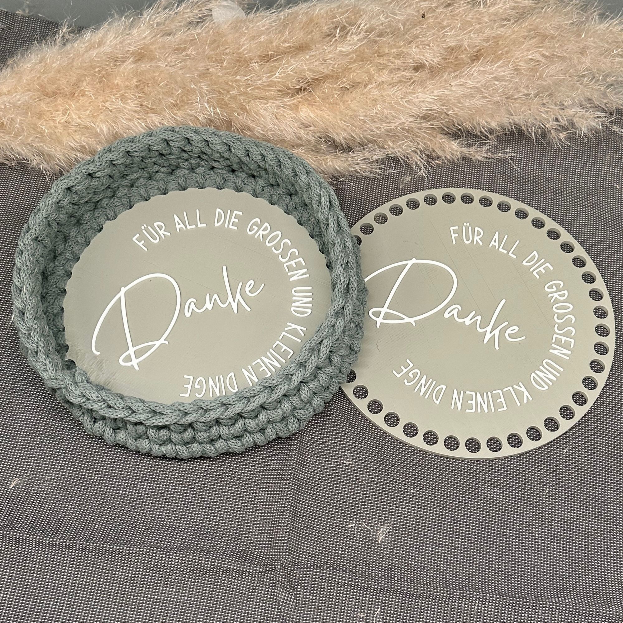 Mit dieser STL-Datei kannst du dir einen Häkelboden mit einem Durchmesser von 18 cm und der Aufschrift „Danke für all die großen und kleinen Dinge“ aus meiner Plotterdatei Momlife für die beliebten Häkelkörbchen drucken. Die 9mm großen Löcher eignen sich perfekt für das beliebte 5mm Garn, das du in meiner Storefront findest (Link in der Sidebar)