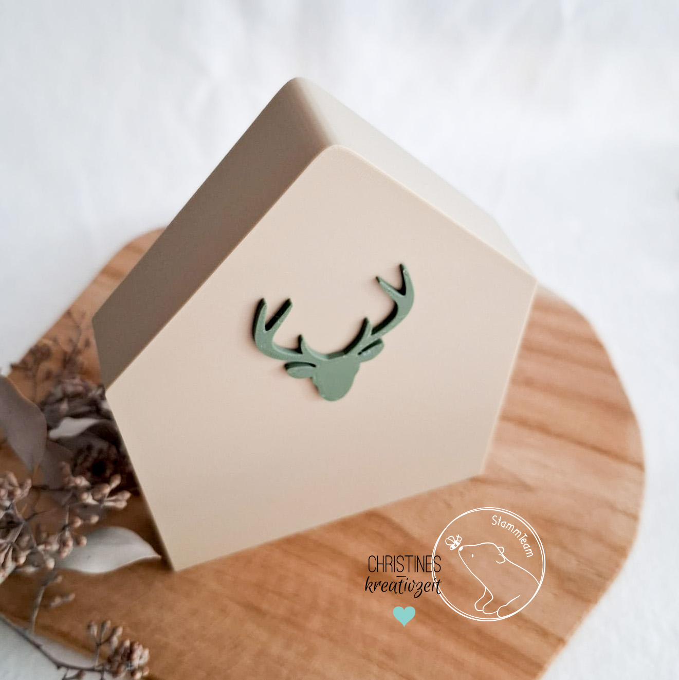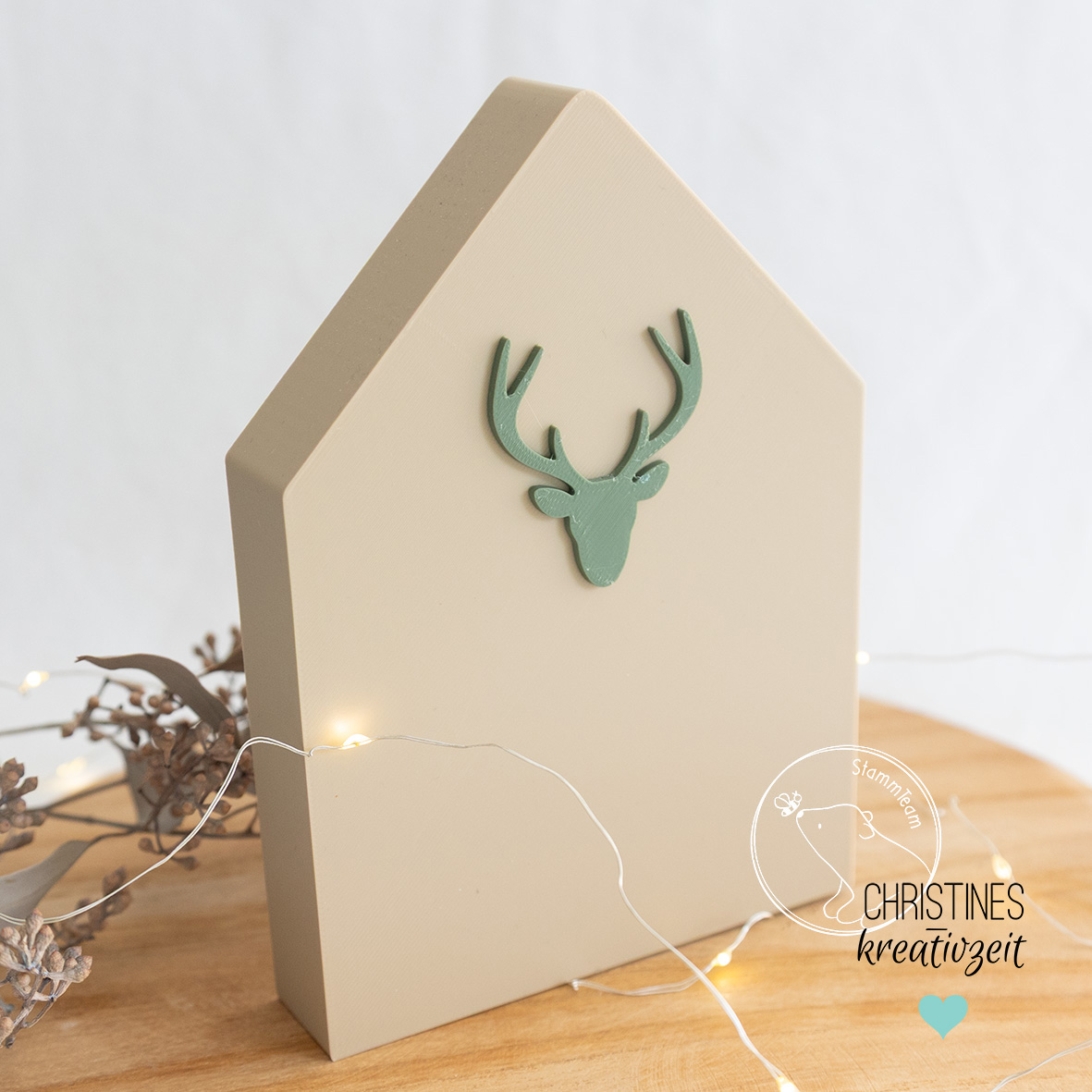 Mit dieser STL-Datei kannst dir dieses tolle Haus mit Hirschkopf zum Hinstellen als wundervolles Dekostück oder zum Verschenken drucken.