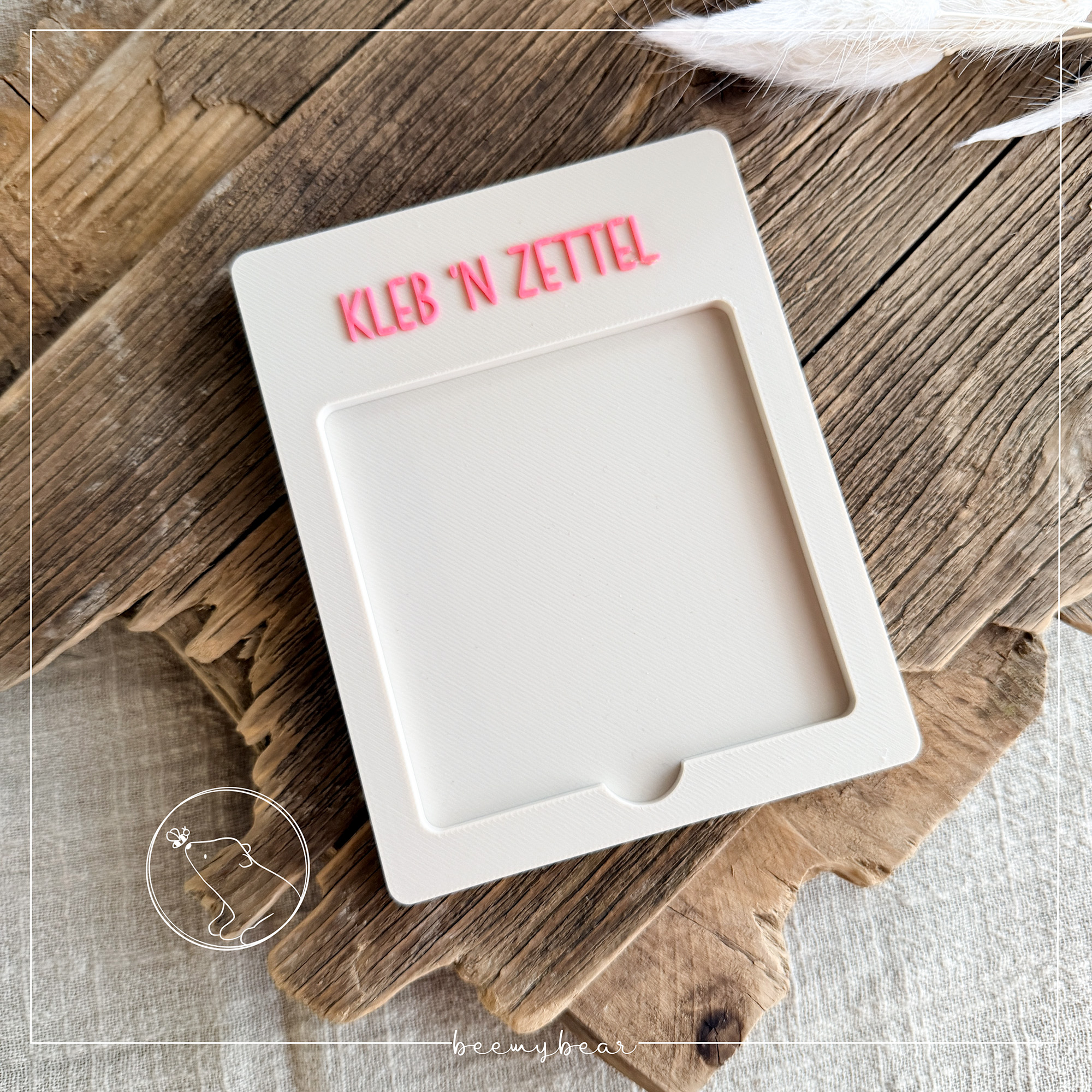 Mit dieser STL-Datei kannst du dir diesen Klebezettelhalter mit dem Spruch „Kleb ’n Zettel“ drucken, der Platz für Klebezettel mit den Maßen 7,6 x 7,6 cm hat. Den Schriftzug kannst du im Slicer noch bunt einfärben.