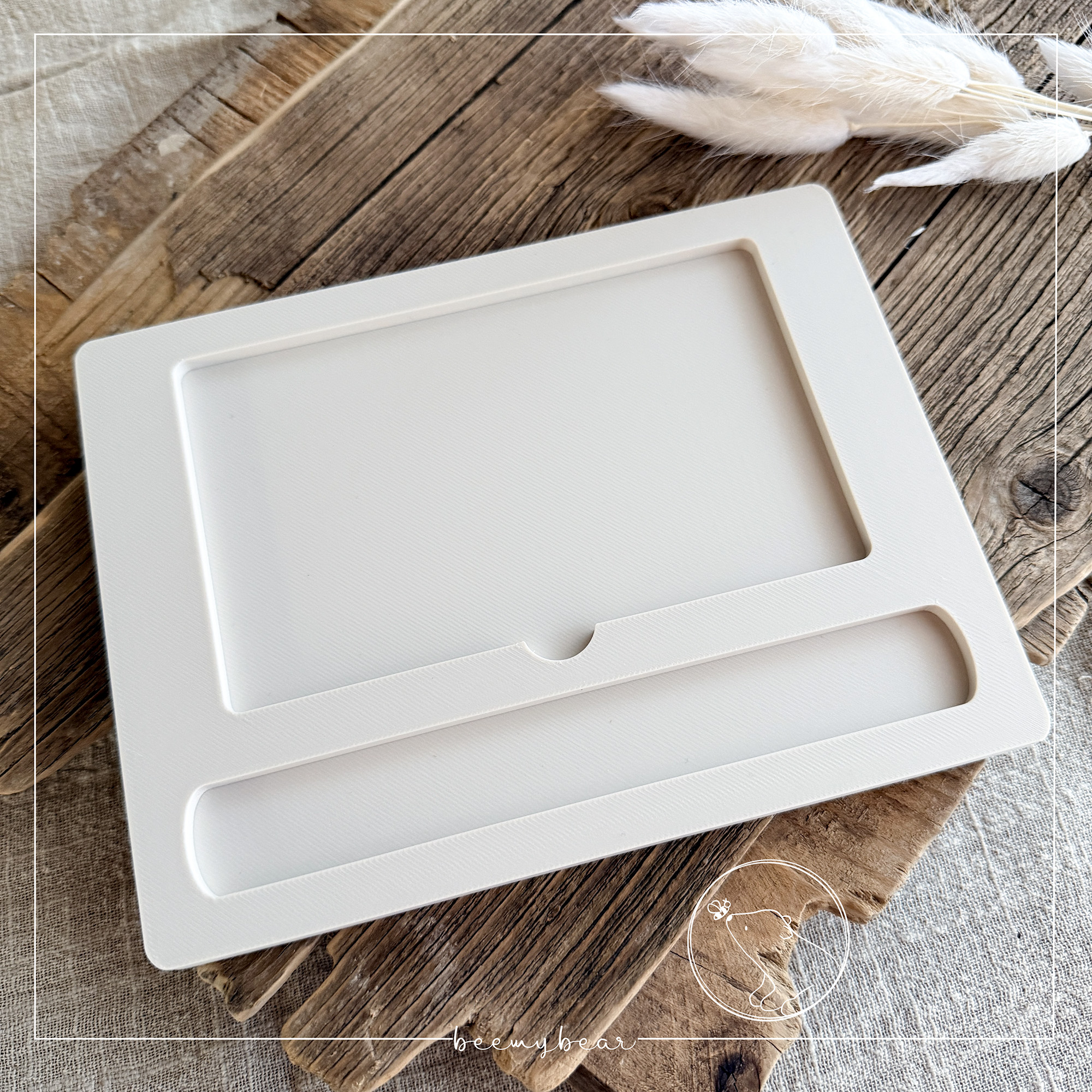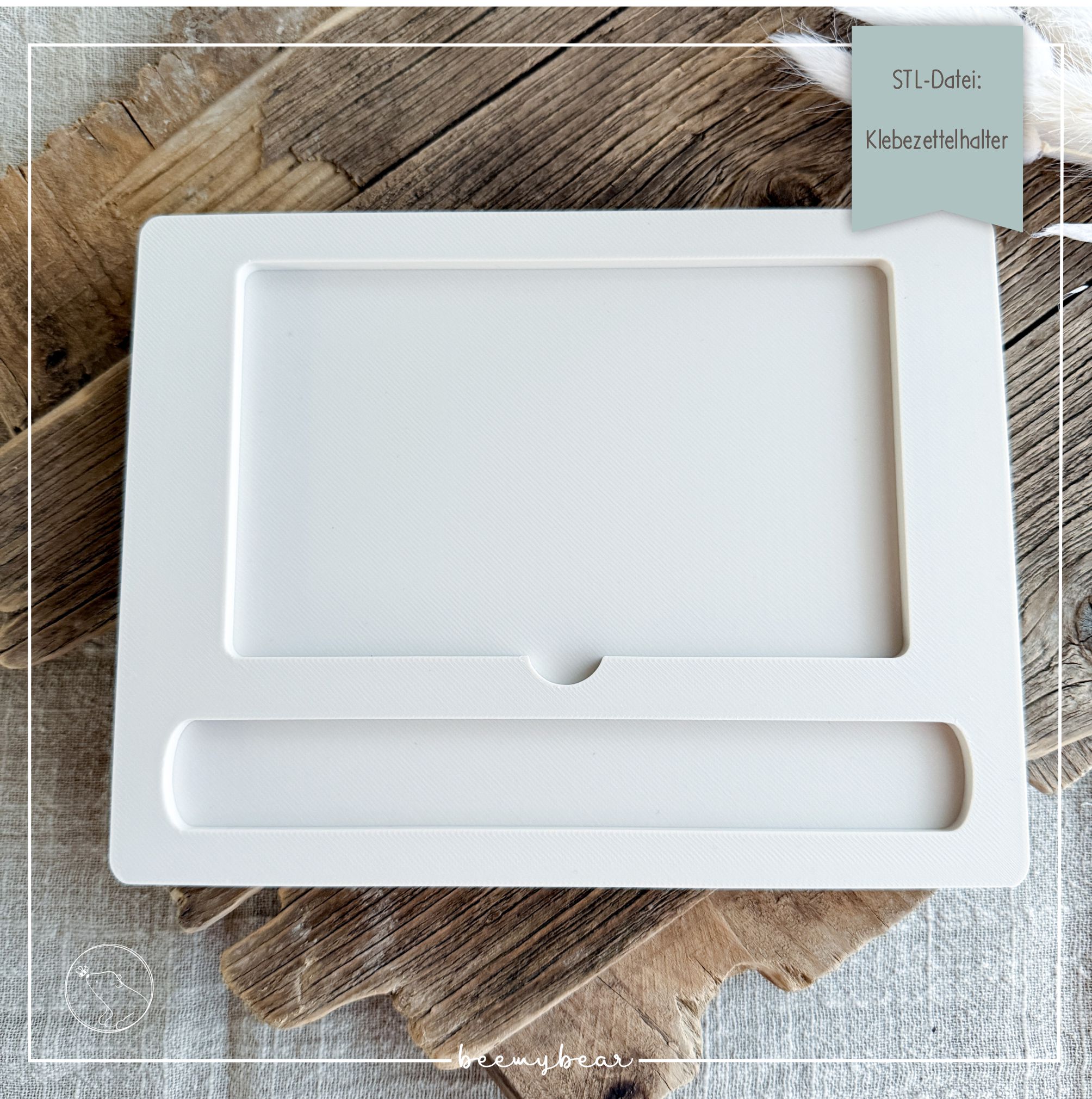 Mit dieser STL-Datei kannst du dir diesen Klebezettelhalter drucken, der Platz für Klebezettel mit den Maßen 7,6 x 12,7 cm und einem Kugelschreiber hat.