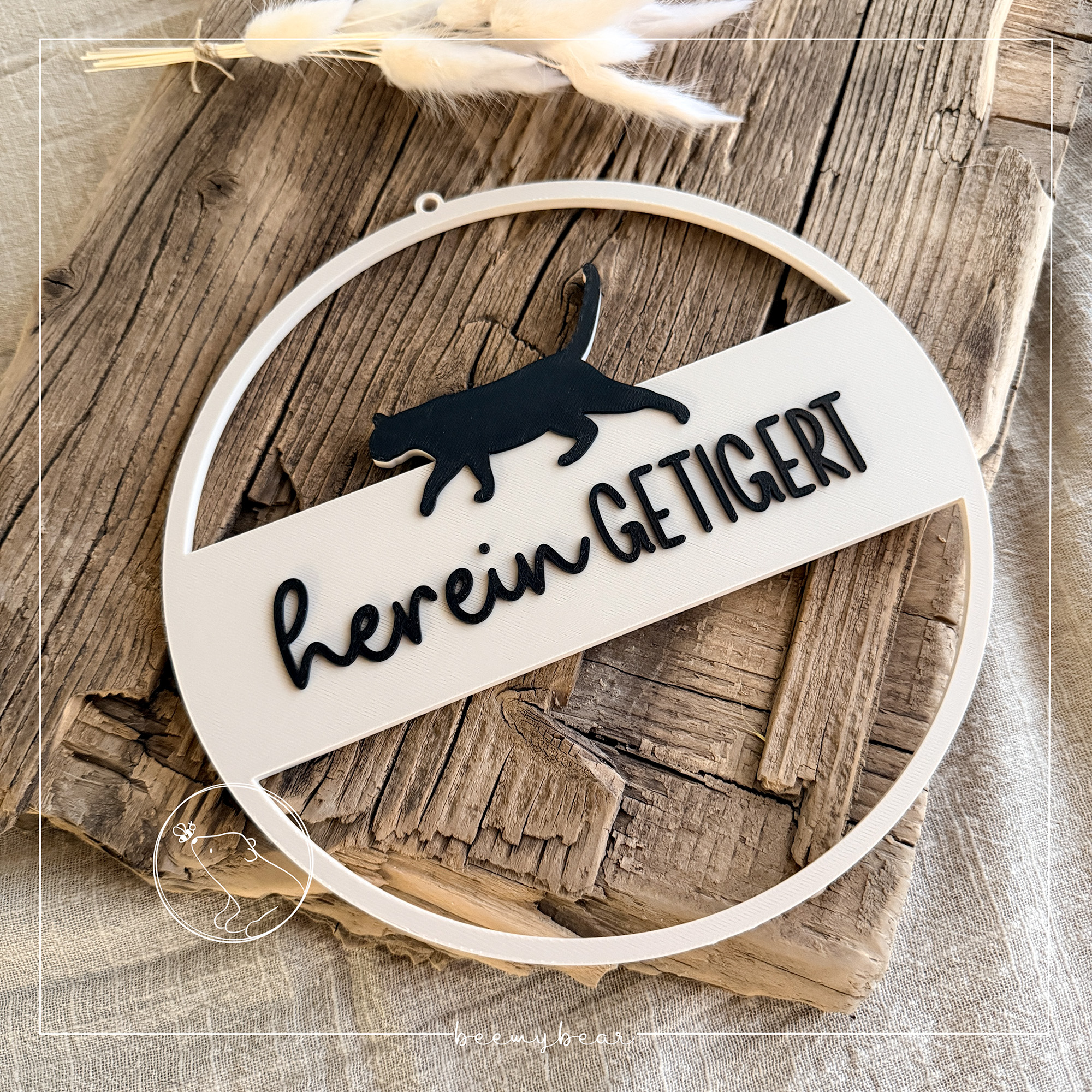 Mit dieser STL-Datei kannst du dir den Loop „hereingetigert“ und einer hübschen Katze drucken. Die Schrift und die Katze kannst du dir in deinem Slicer anders einfärben, so dass ein zauberhafter Effekt entsteht. Ein toller Hingucker an deiner Haustür oder süßes Mitbringsel.