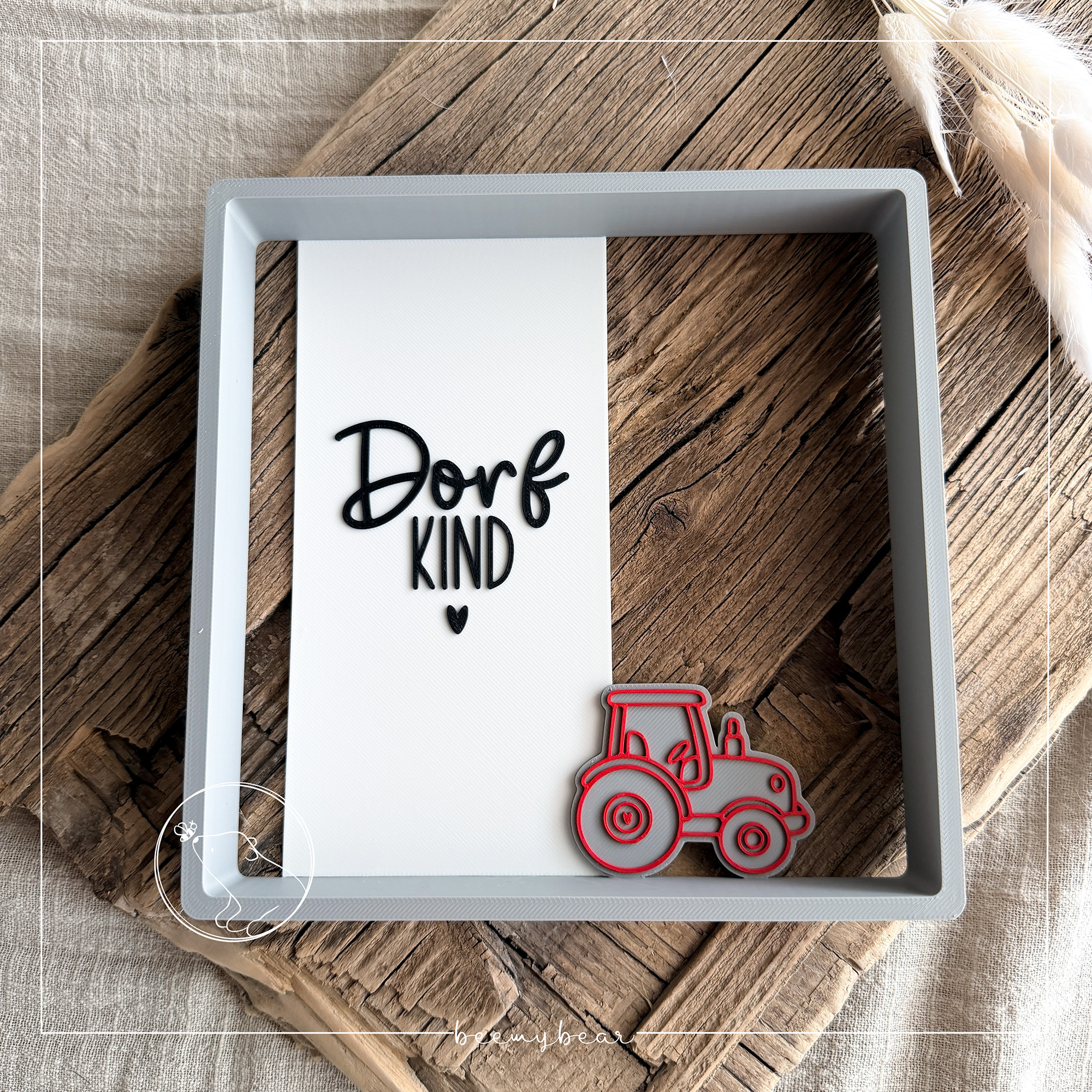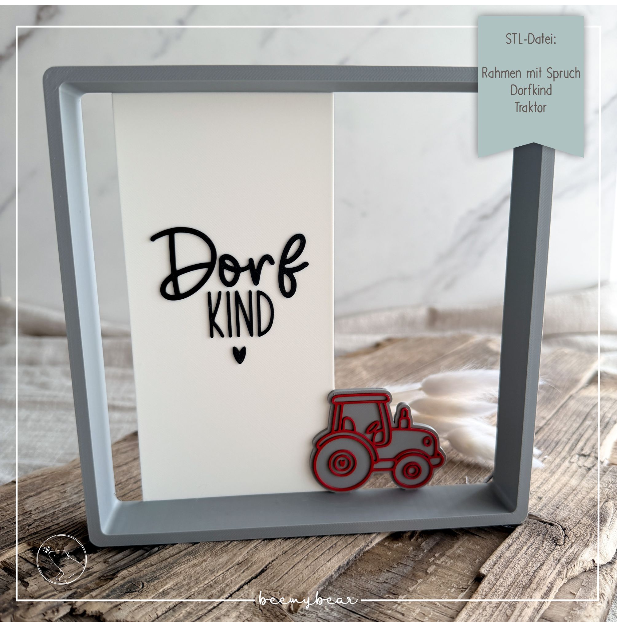 Mit dieser STL-Datei kannst du dir diesen hübschen Rahmen mit dem Spruch „Dorfkind“ und einem süßen Traktor drucken.