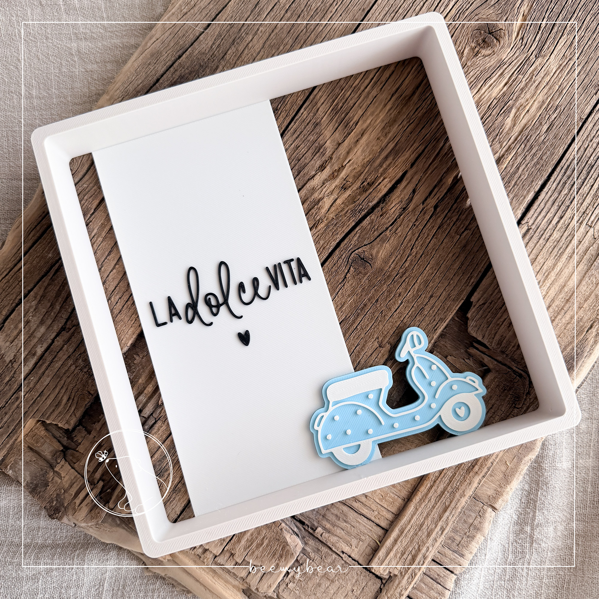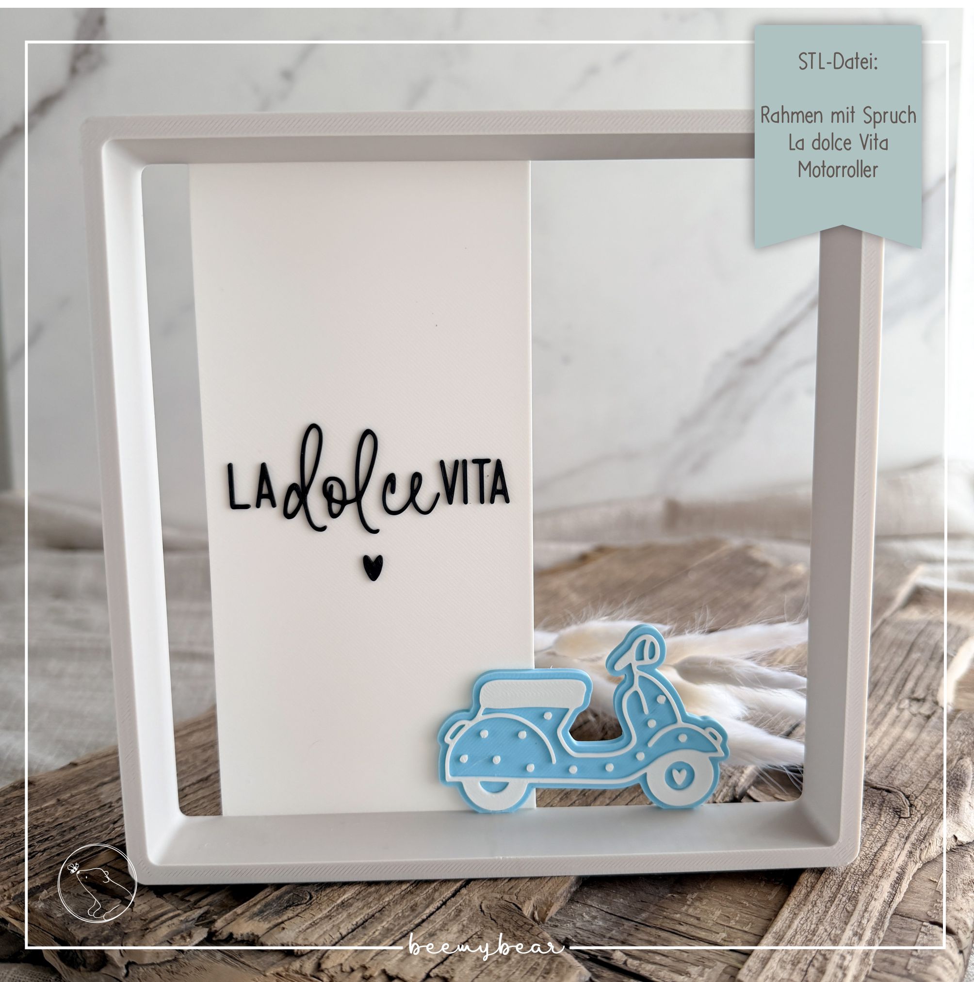 Mit dieser STL-Datei kannst du dir diesen hübschen Rahmen mit dem Spruch „La dolce Vita“ und einem süßen Motorroller drucken.