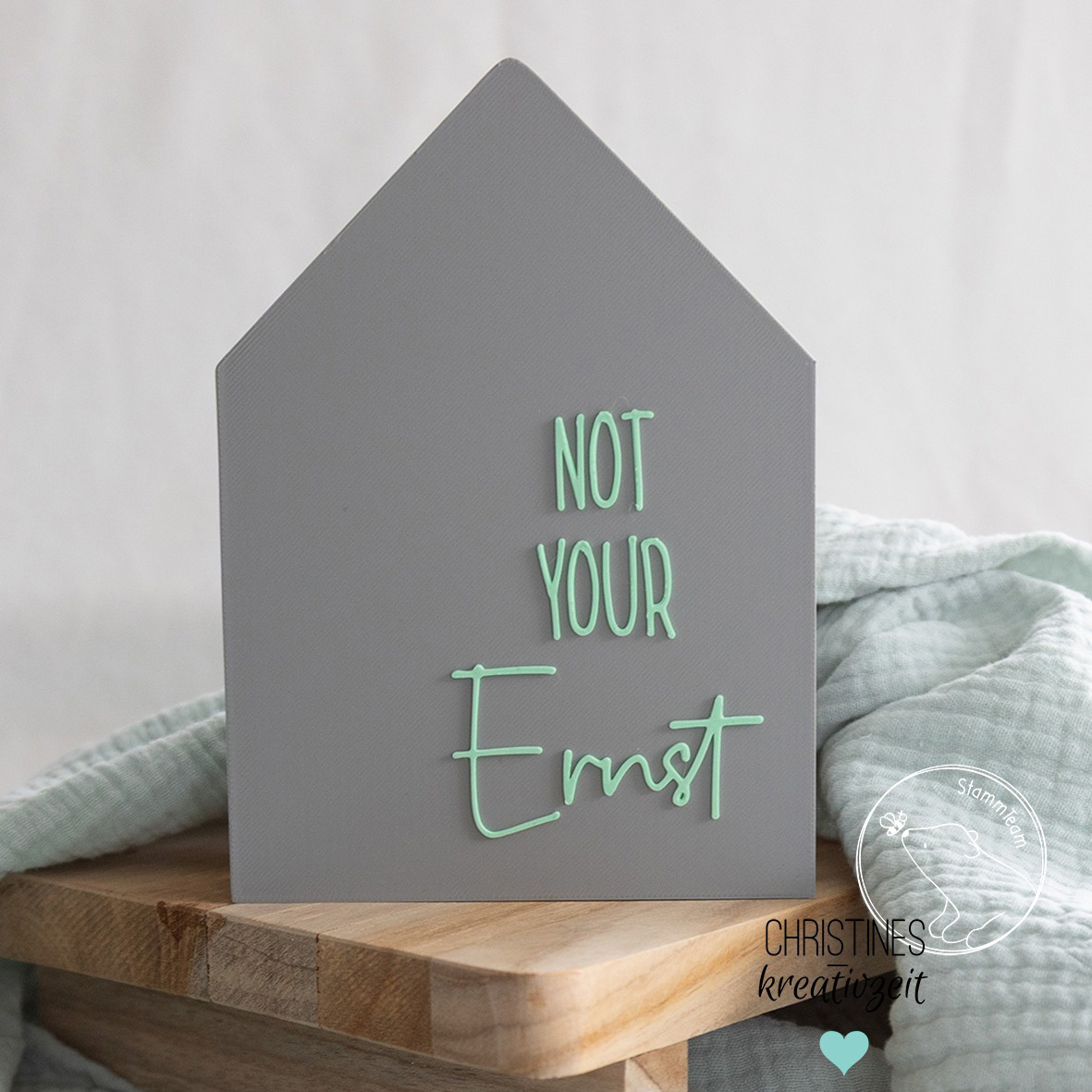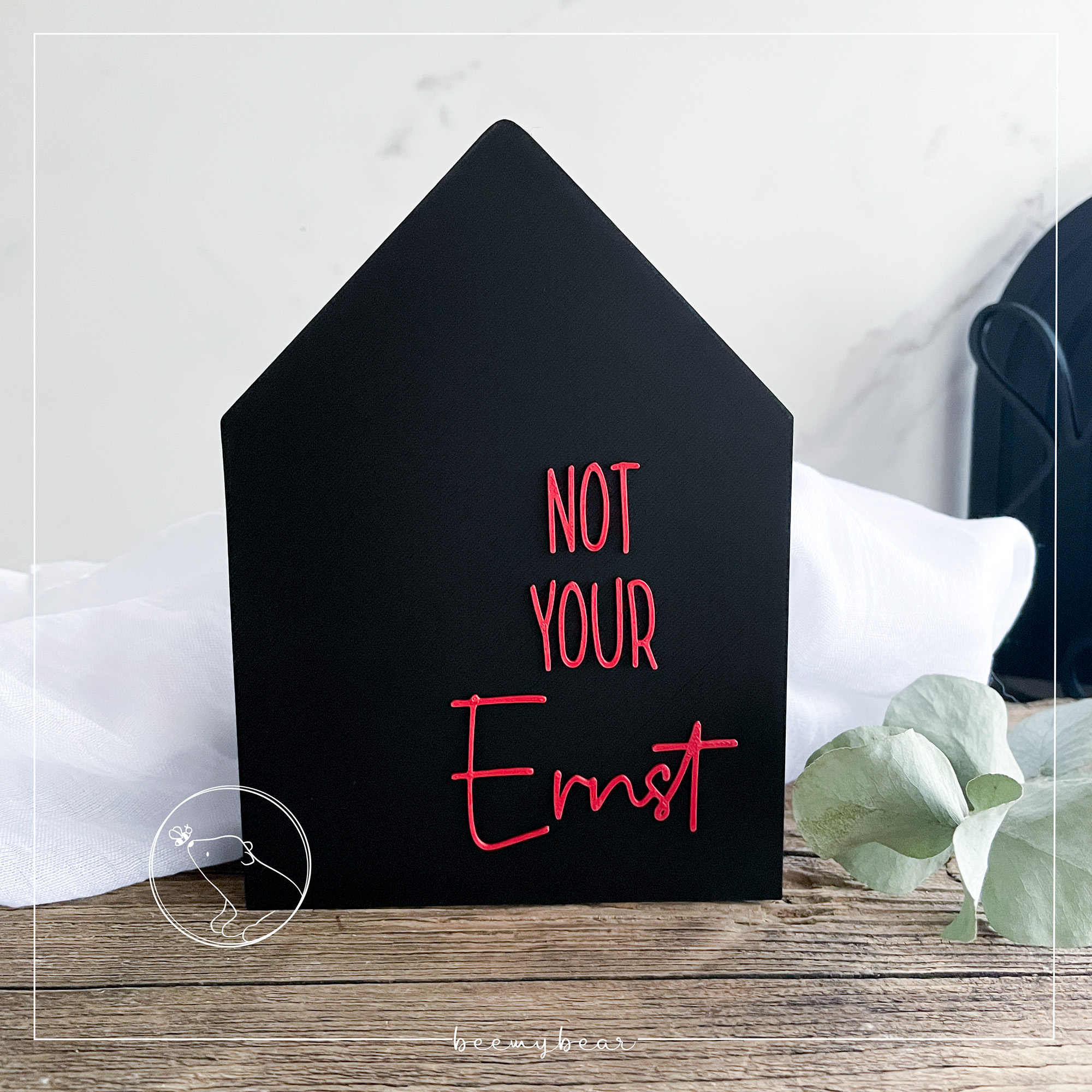 Mit dieser STL-Datei kannst dir dieses Haus mit dem Spruch „Not your Ernst“ aus meiner Sassy-Reihe drucken, ein witziger Hingucker in deinem Zuhause oder tolles Geschenk.