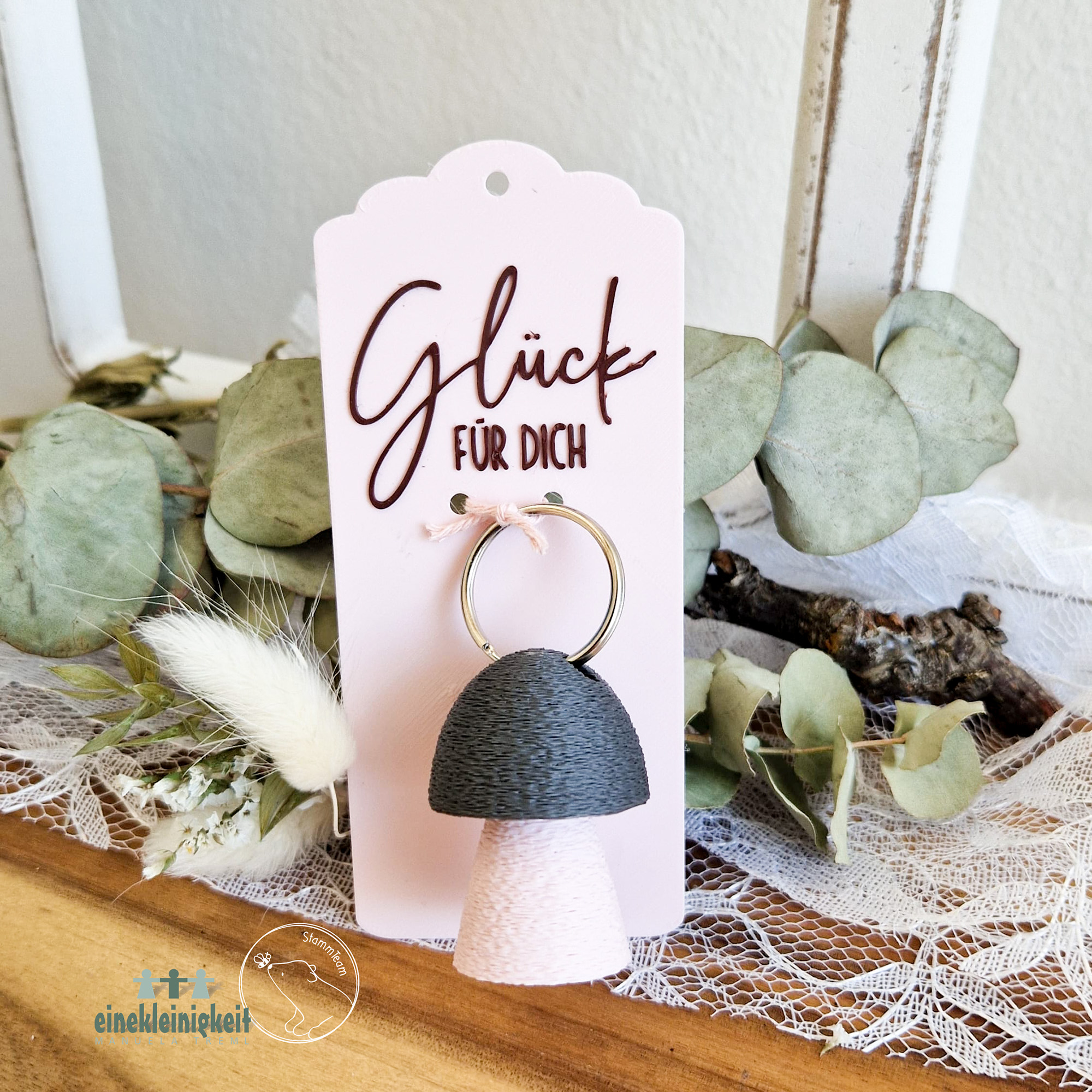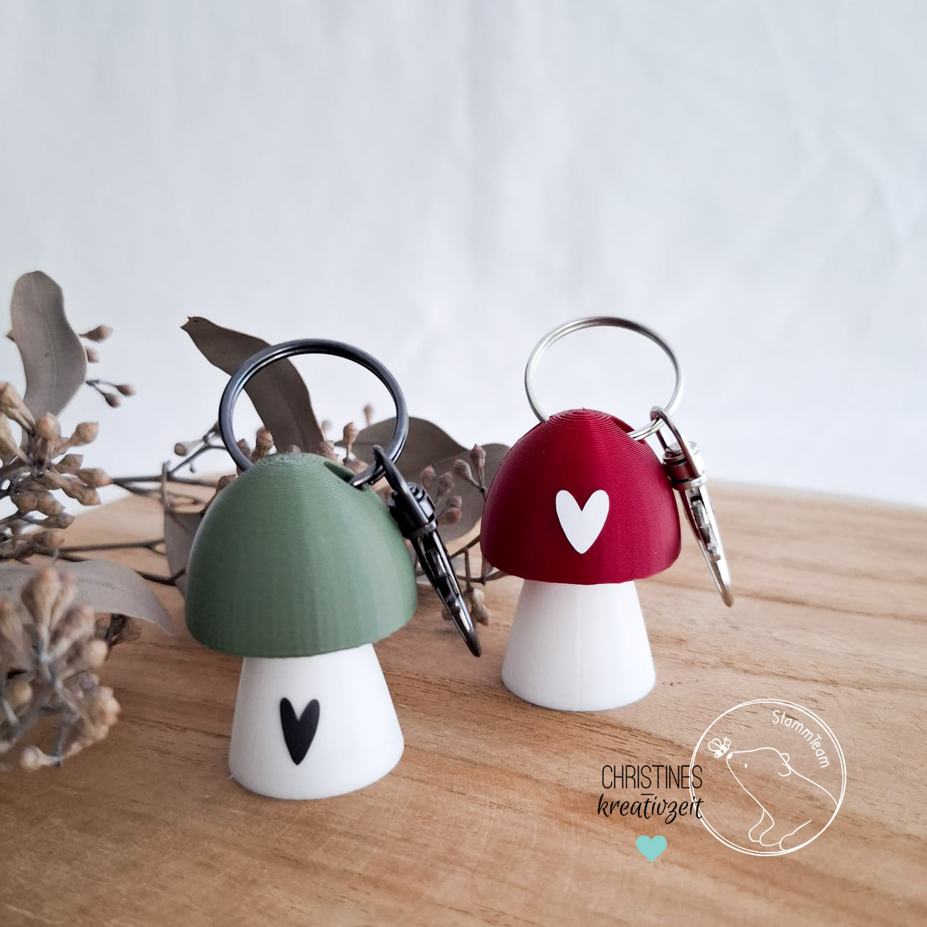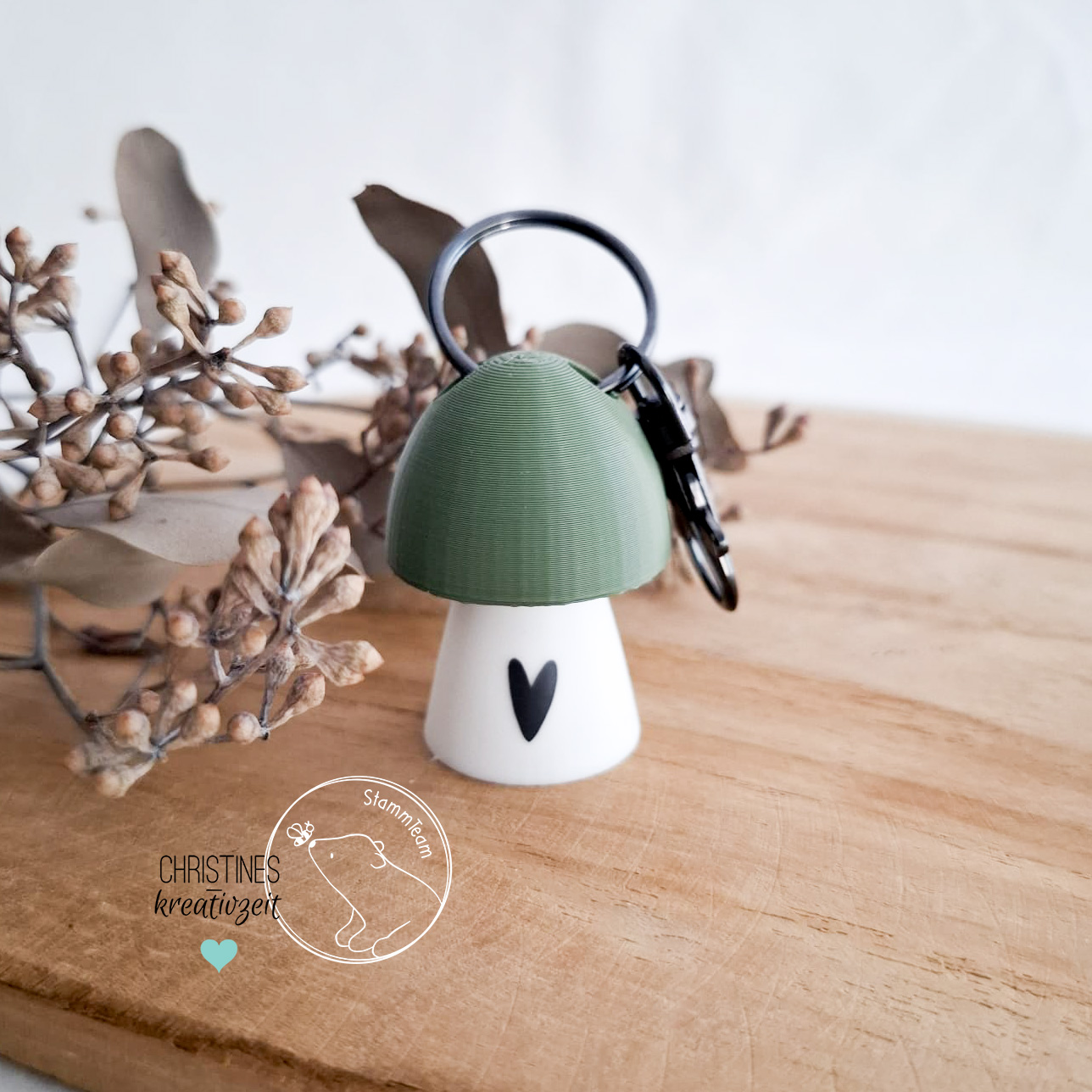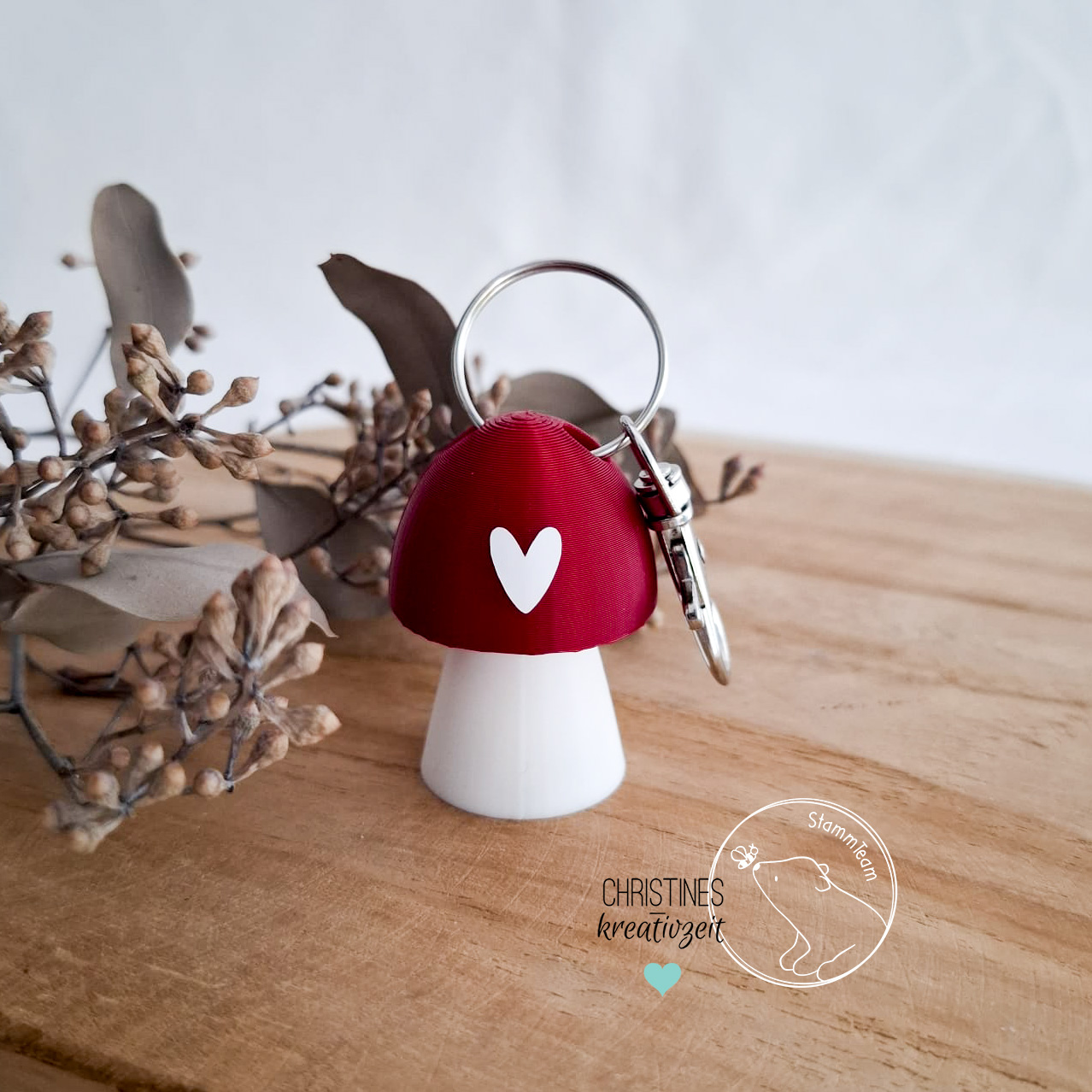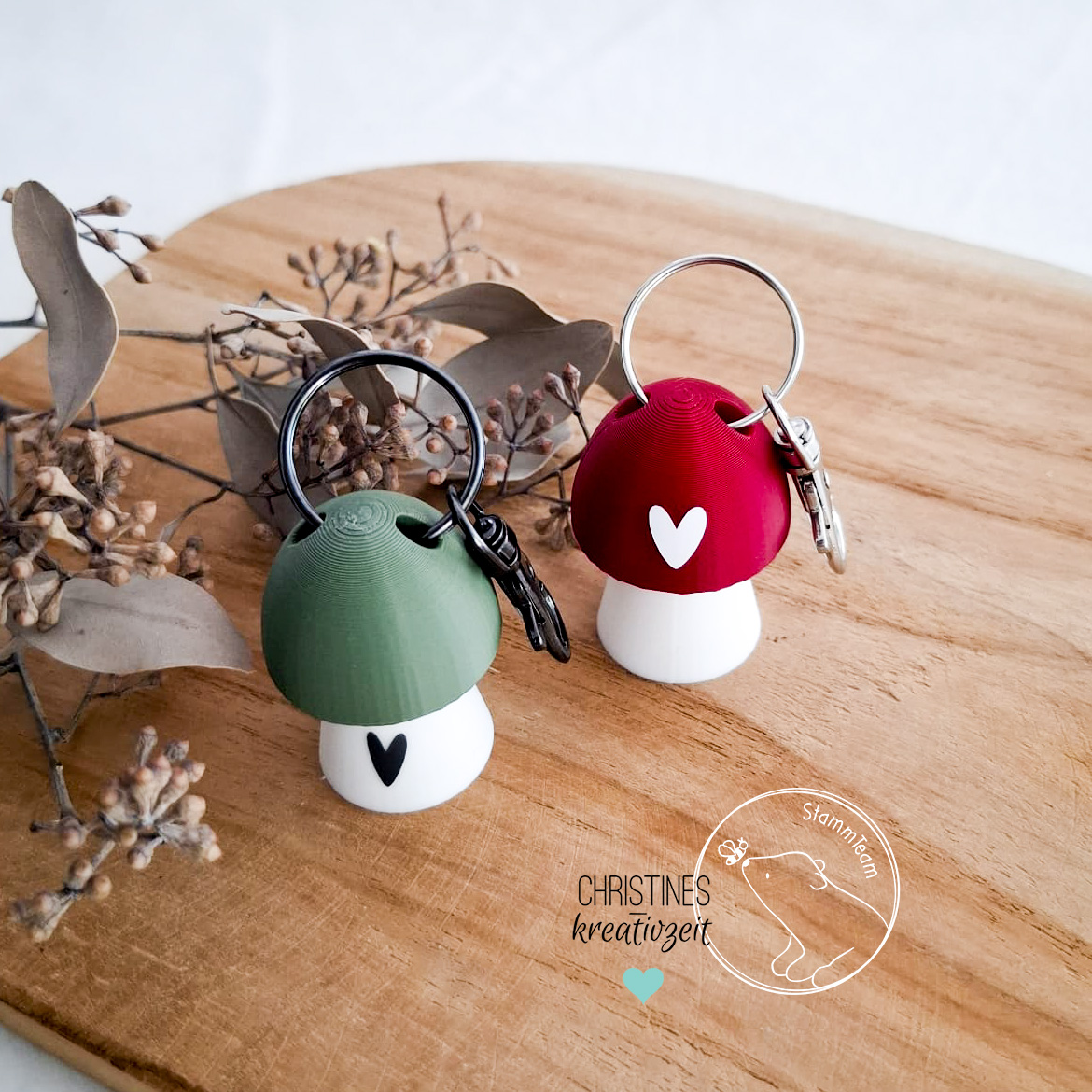 Mit dieser STL-Datei kannst dir einen süßen Pilz als Schlüsselanhänger drucken. Perfekt als kleines, herbstliches Geschenk oder für den eigenen Schlüsselbund. Die Herzen auf dem Titelbild sind geplottet, der Pilz in der Datei enthält kein Herz. So kann man die enorme Reinigung und den Filament-Verbrauch verringern. Das Herz zum Plotten ist in der Datei dabei. Natürlich sieht der Pilz auch ohne Herz ganz zauberhaft aus. Der kleine Pilz passt perfekt auf unseren Geschenkanhänger/Label Glück für dich.