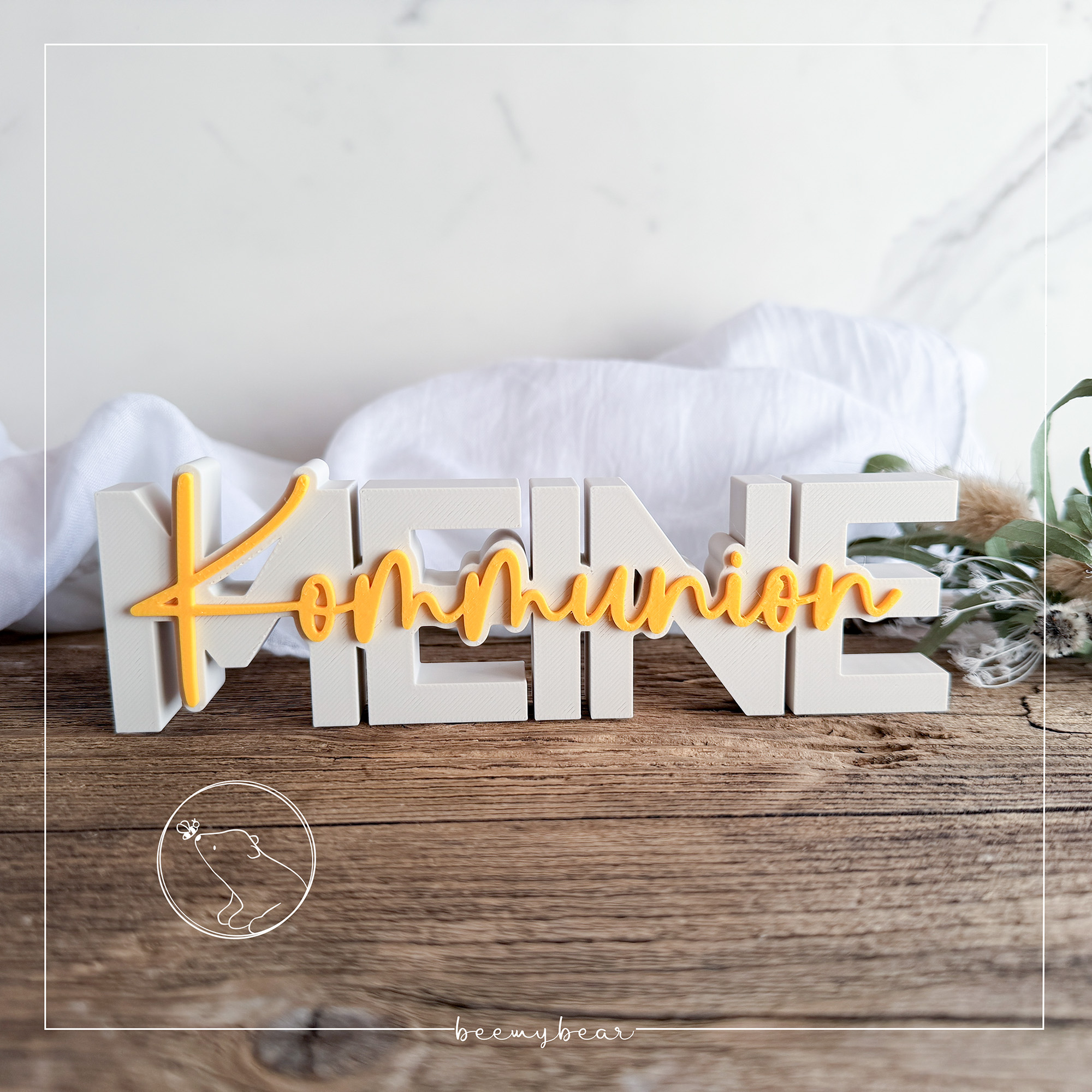 Mit dieser STL-Datei kannst du dir den Schriftzug „Meine Kommunion“ drucken. Die filigrane Schrift kannst du dir in deinem Slicer anders einfärben, so dass ein zauberhafter Effekt entsteht. Ein toller Hingucker oder süßes Mitbringsel.