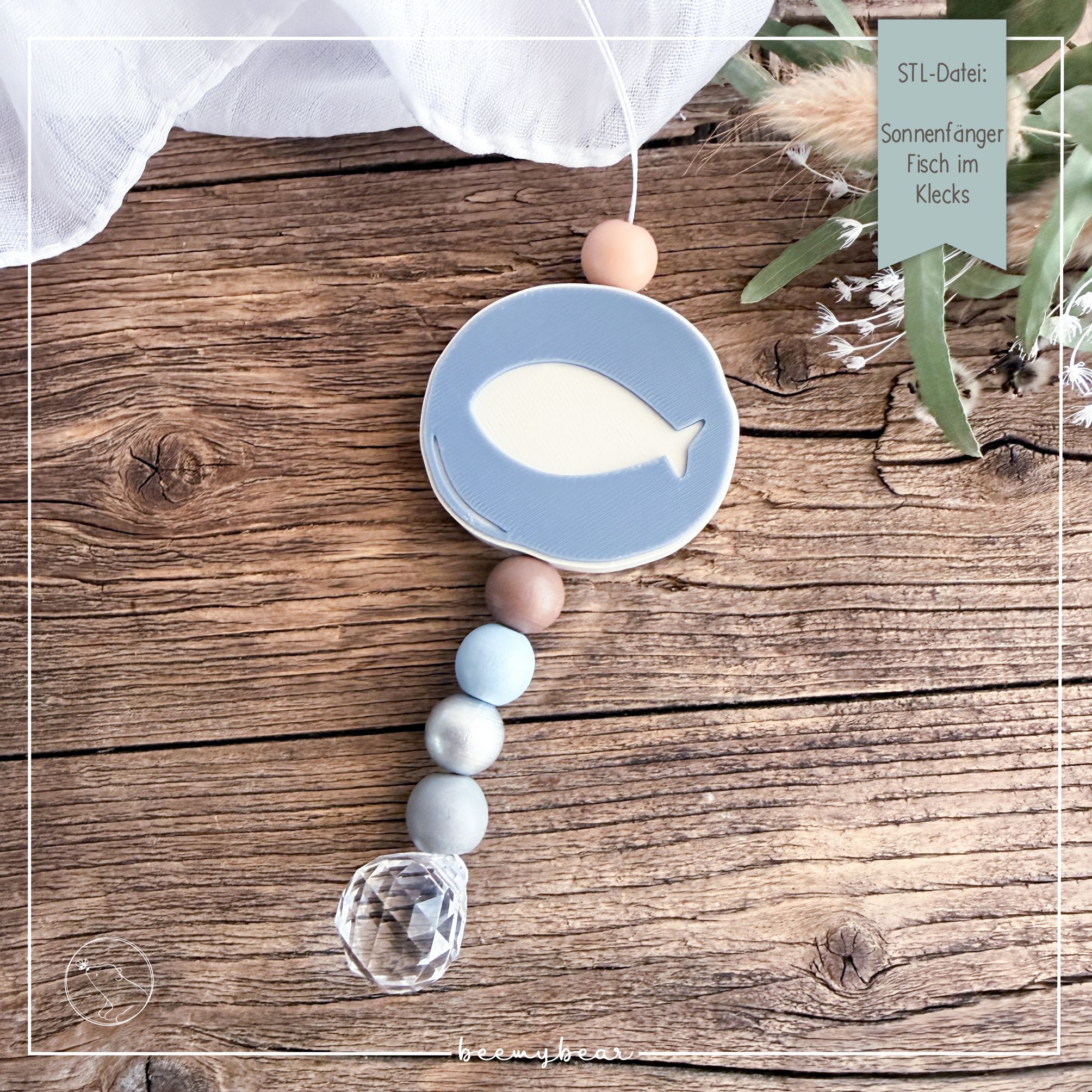 Mit dieser STL-Datei kannst dir diesen hübschen Fisch im Klecks drucken, der sich perfekt eignet, um damit deine Sonnenfänger aufzuhübschen. Meine zweifarbigen Sonnenfänger-Motive sind auf der Rückseite glatt, anders als meine Sonnenfänger mit Gravur. Du kannst dir die obere Schicht farbig in deinem Slicer einfärben, für einen besonderen Effekt. Passende Kristalle findest du in unserem Amazon-Store (Link in der Sidebar).