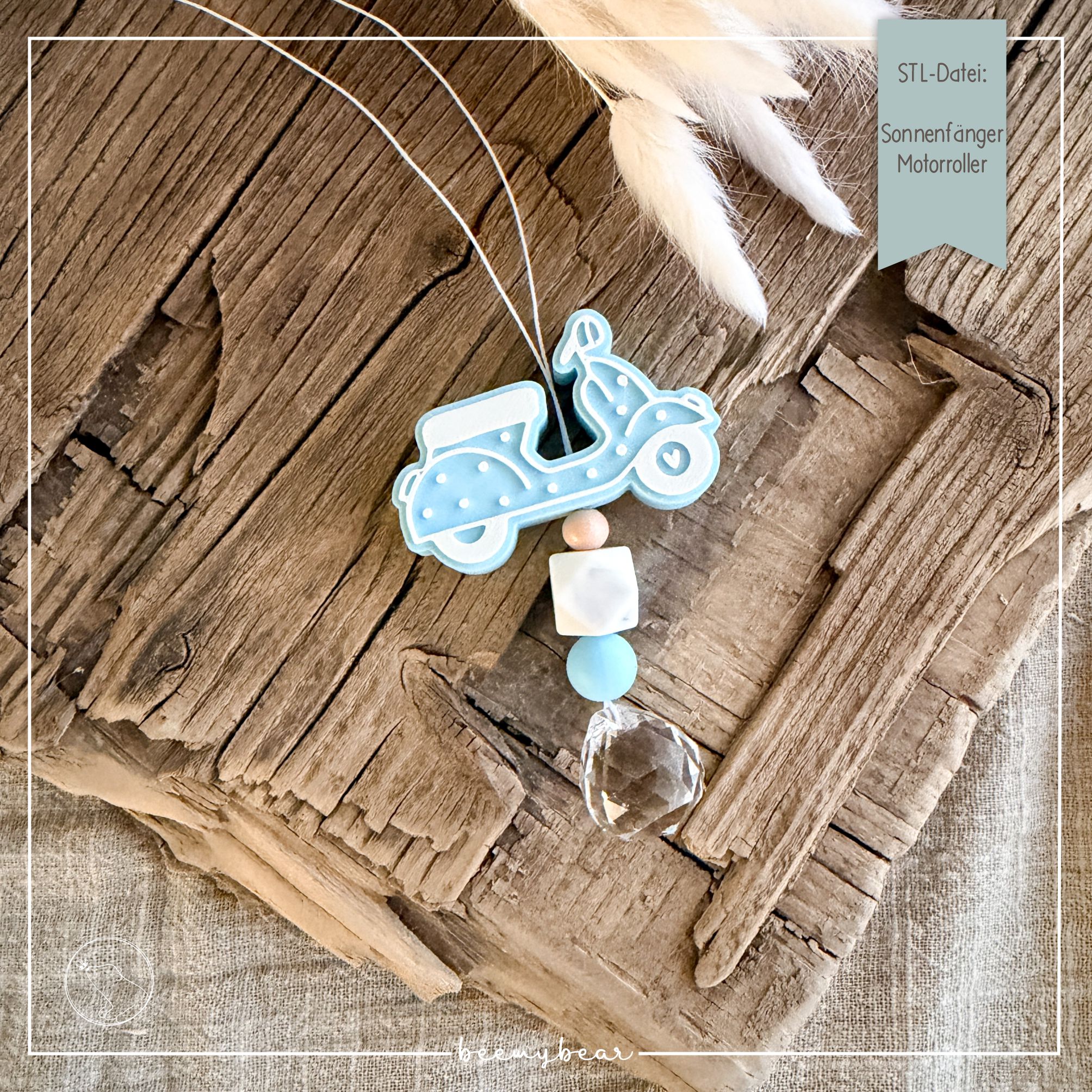 Mit dieser STL-Datei kannst dir meinen hübschen Motorroller aus der Plotterdatei Travel drucken, der sich perfekt eignet, um damit deine Sonnenfänger aufzuhübschen. Meine zweifarbigen Sonnenfänger-Motive sind auf der Rückseite glatt, anders als meine Sonnenfänger mit Gravur. Du kannst dir die obere Schicht farbig in deinem Slicer einfärben, für einen besonderen Effekt. Ein entsprechendes Tutorial findest du im KreativWiki. Passende Kristalle findest du in unserem Amazon-Store (Link in der Sidebar).