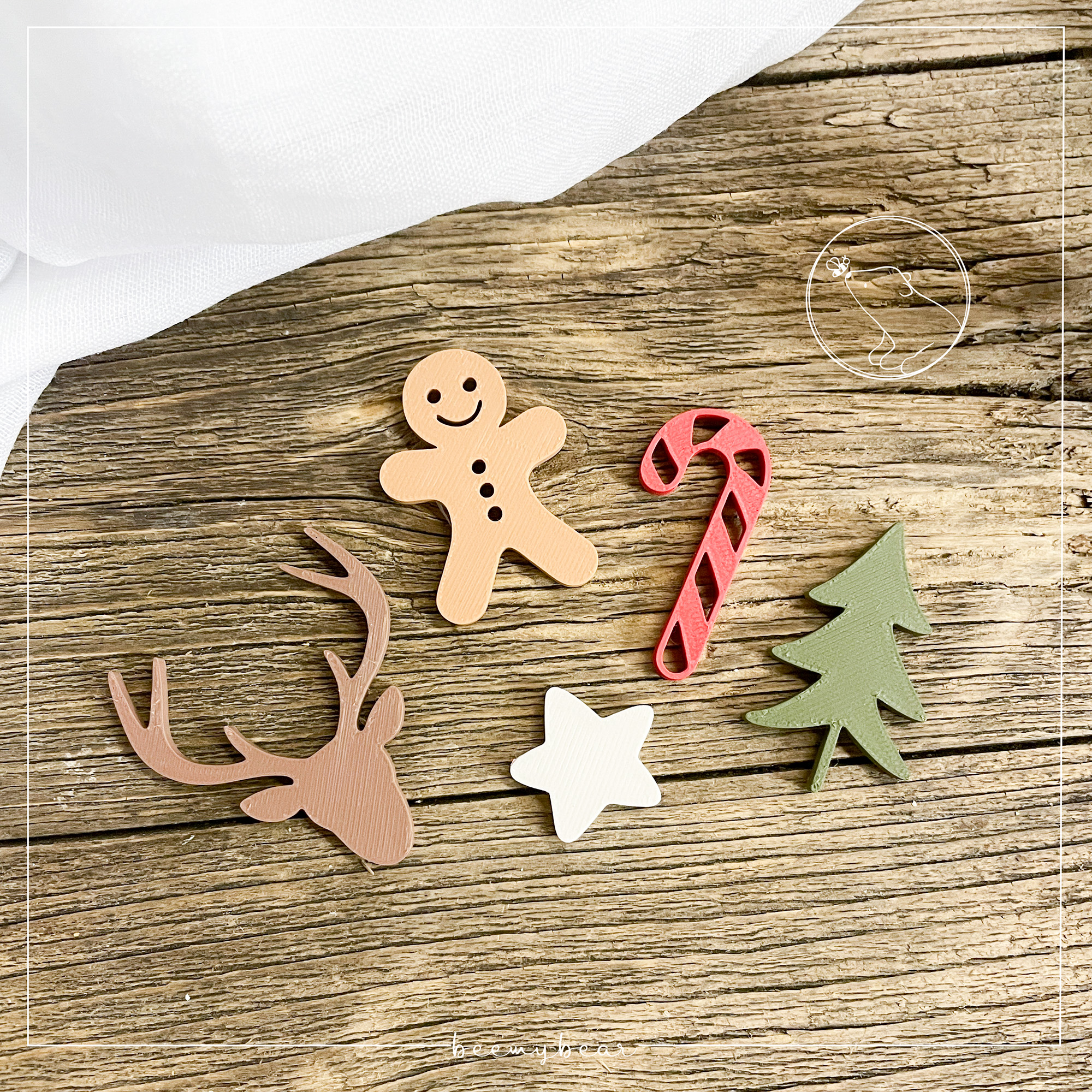 Mit dieser STL-Datei kannst dir zauberhafte weihnachtliche Streudeko drucken. Enthalten sind ein Hirschkopf, kleiner Stern, Tannenbaum, Lebkuchenmännchen und Zuckerstange.