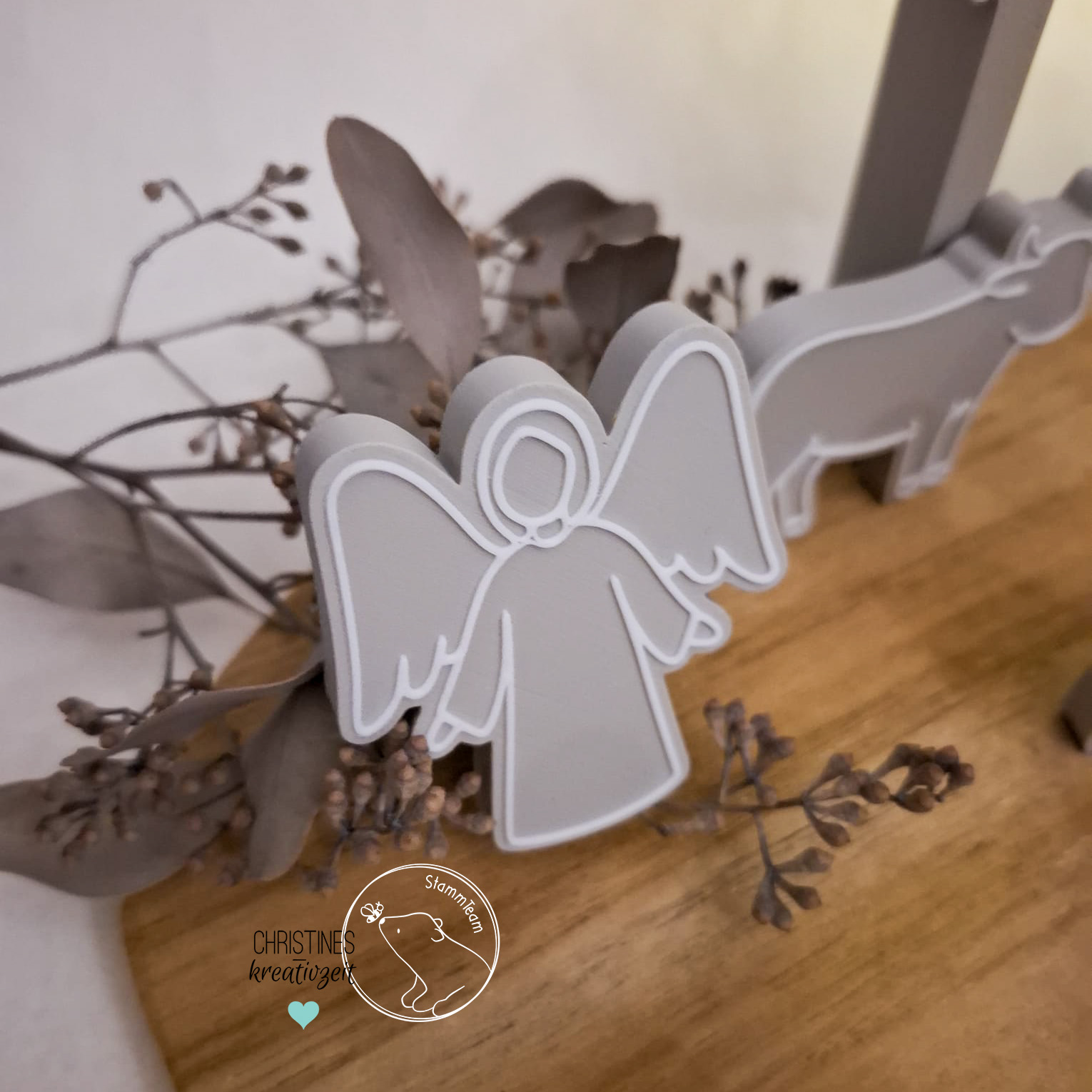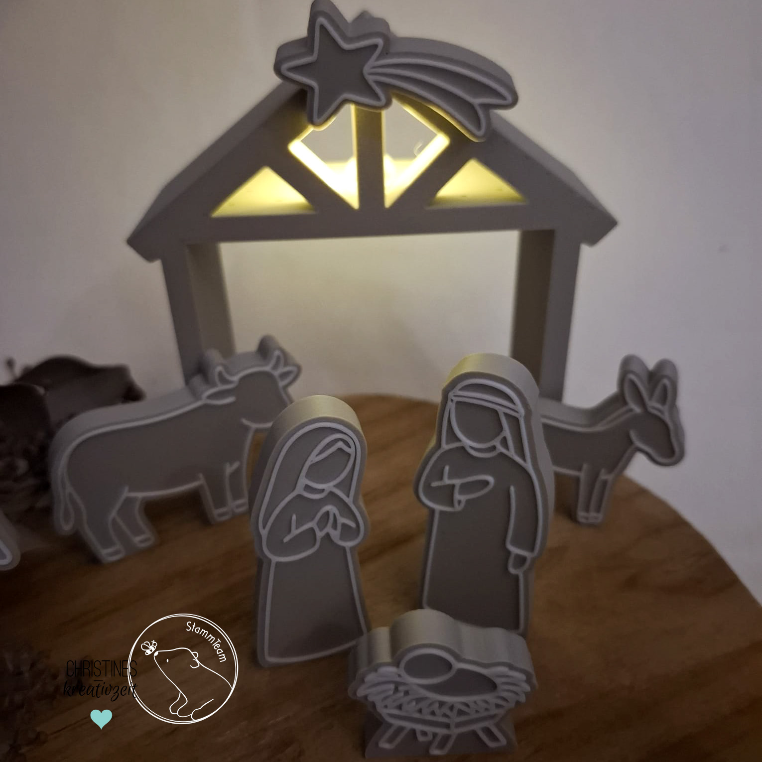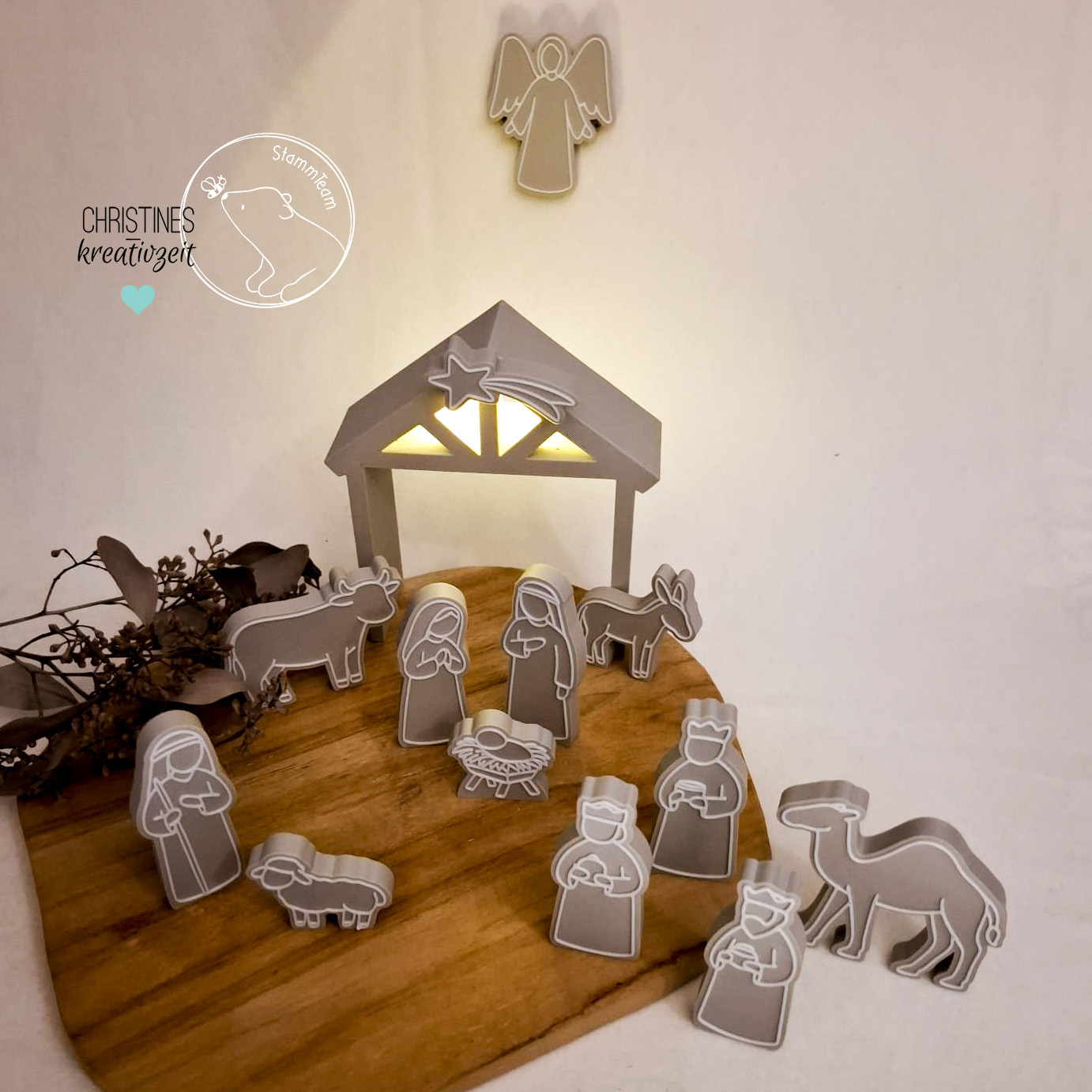 Mit dieser STL-Datei kannst dir eine wundervolle Weihnachtskrippe mit vielen Motiven und einem Stall, der beleuchtet werden kann, drucken. Die Beleuchtung kann mittels eines Ballonlichts erfolgen oder man legt eine Mini-Lichterkette ins Dach. Der Stern kann aufgeklebt werden und der Engel ist fliegend und stehend enthalten.