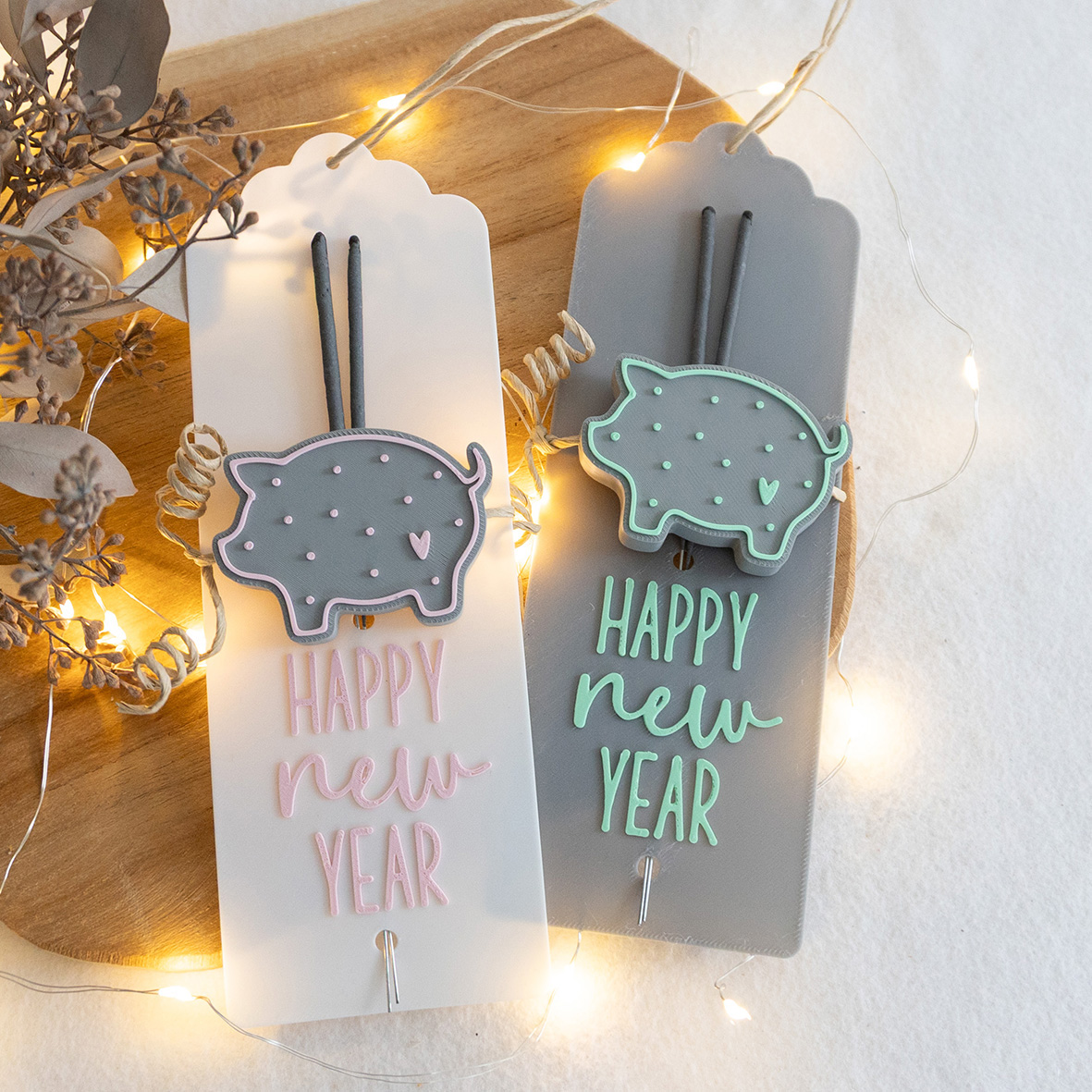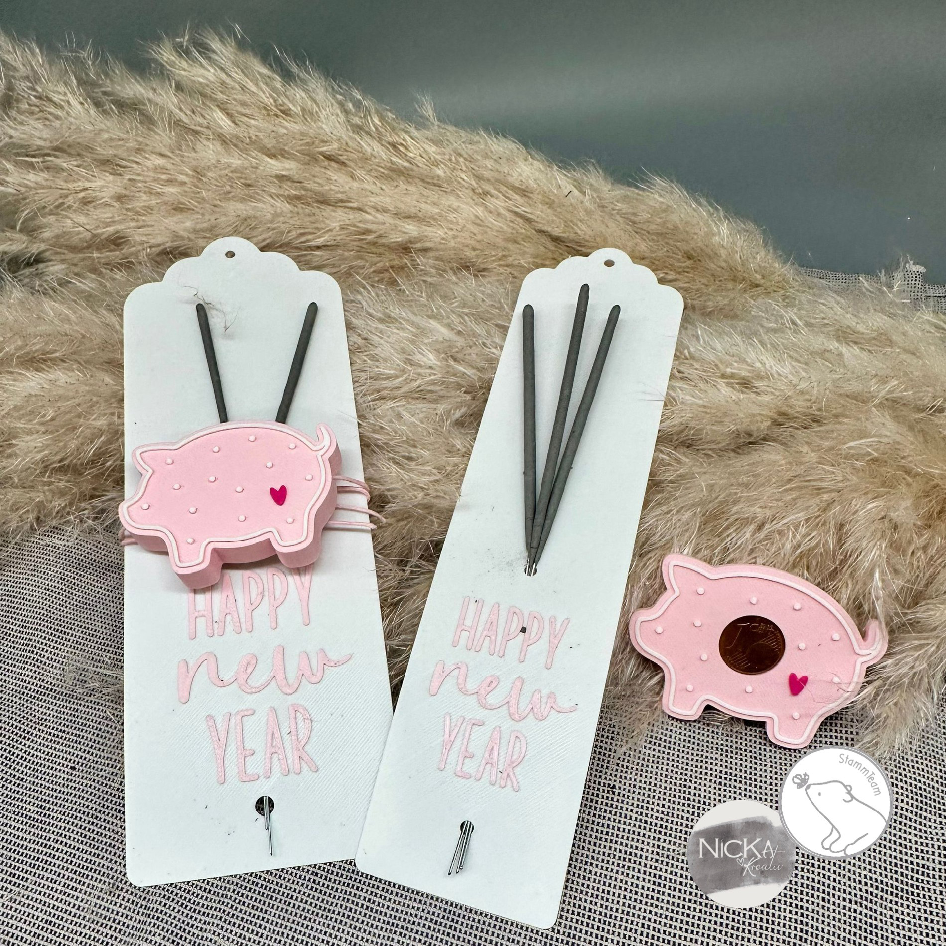 Drucke dir einen hübschen Wunderkerzenhalter mit passendem Glücksschwein. Der Halter ist in 2 Größen enthalten. Bitte beachte, dass sie größer sind als die Druckfläche des A1 minis und du sie dir schräg auf die Druckplatte legen musst.