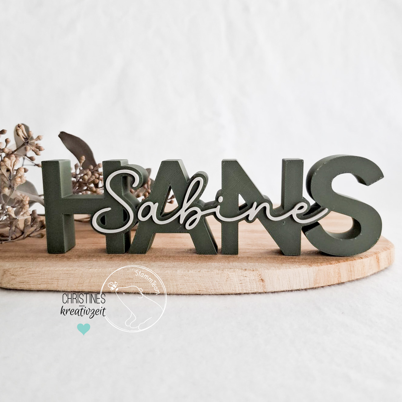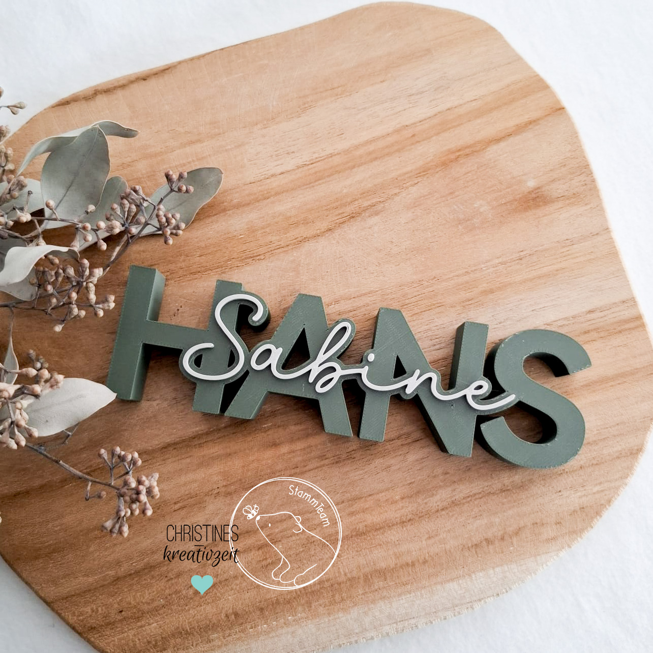 Schreibe uns deine beiden Wunschnamen ins Kommentarfeld an der Kasse und gib an, welcher Name in Druckschrift und welcher in Schreibschrift sein soll. Du erhältst nach deiner Bestellung vorab von uns eine Email mit einer Grafik, ob alles korrekt ist und im Anschluss an deine Freigabe dann die STL-Datei für dich zum Drucken.